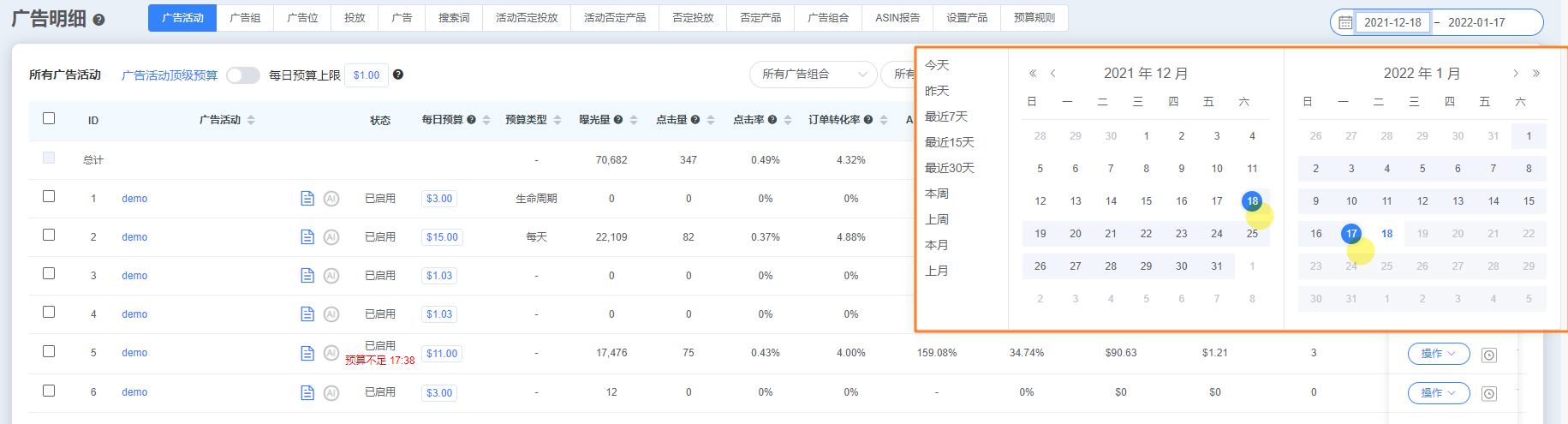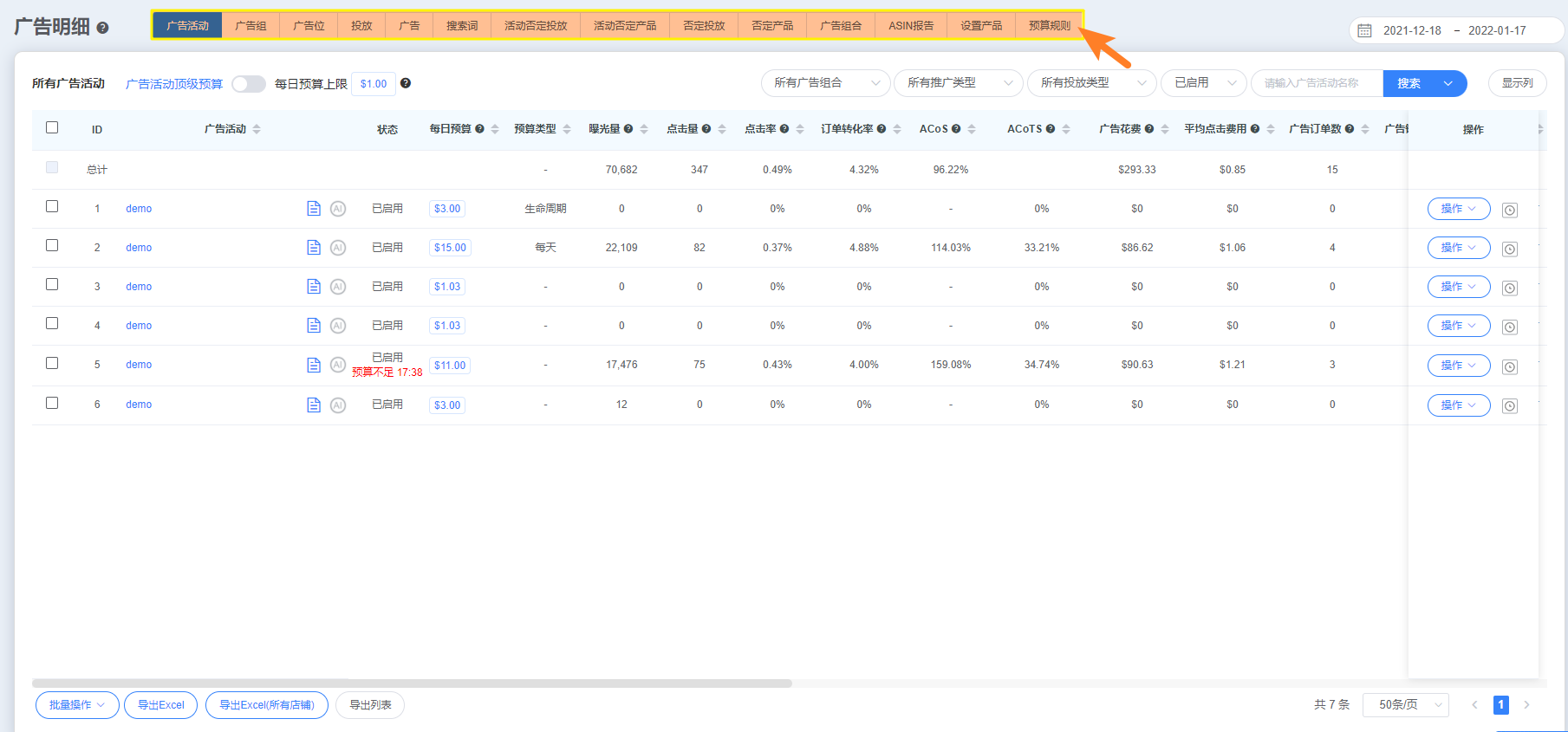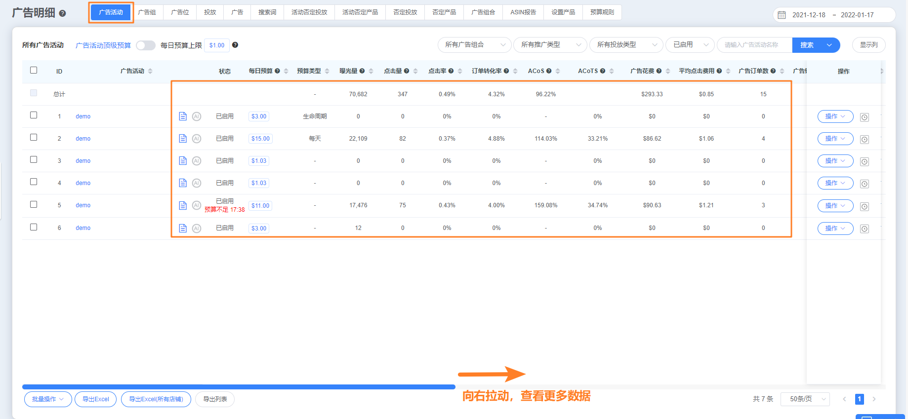 (1)展示店铺/站点所有广告活动不同层级的多维度数据,提升数据浏览体验