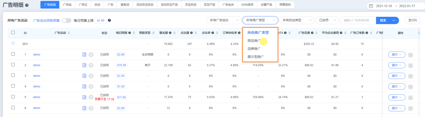 选择“广告活动”,系统自动展示用户负责店铺的所有广告活动,包括商品推广、品牌推广、展示型推广,同时提供包括各广告活动的广告KPI、预算、广告销售数据、广告设置等多种详细数据。