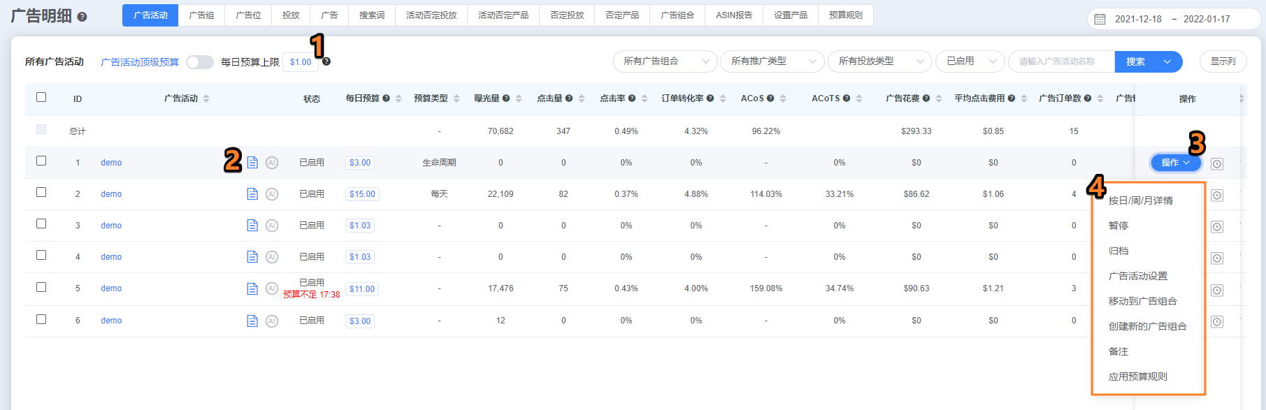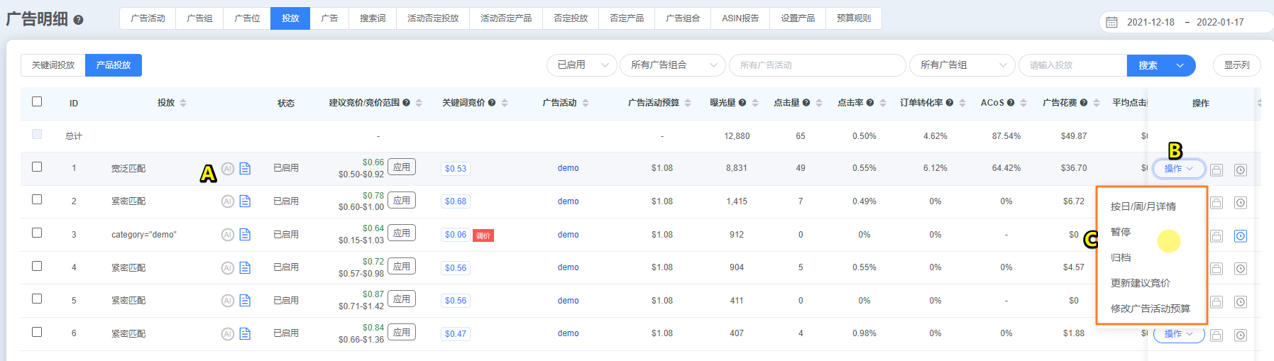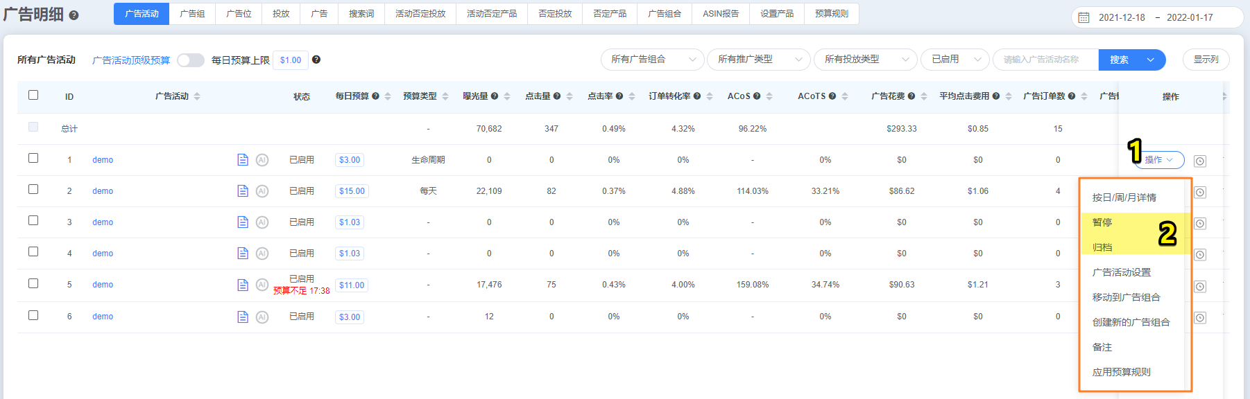 如需暂停、归档广告投放,、更新建议竞价或修改广告活动预算,点击“操作”,选择对应选项即可。