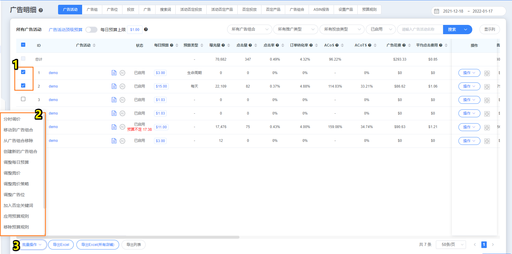 如需进行批量操作,可勾选多个广告活动,点击左下方的“批量操作”选项,选择对应操作。
