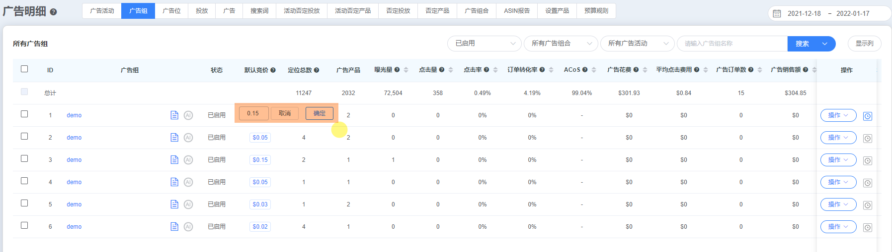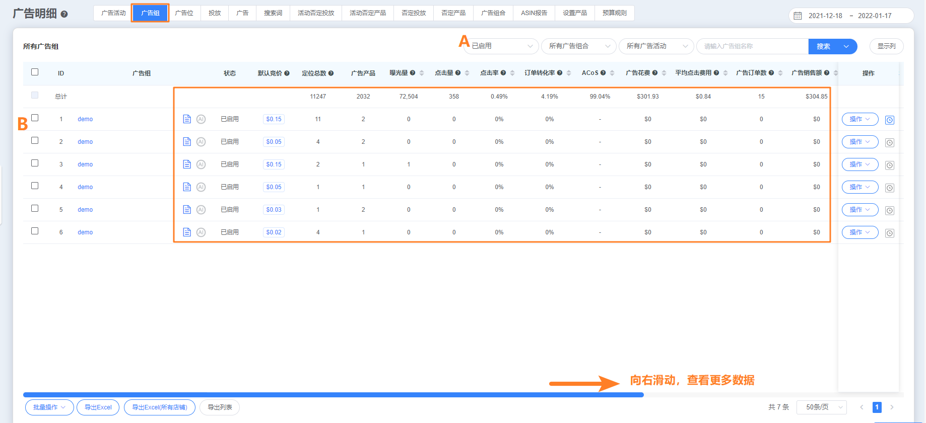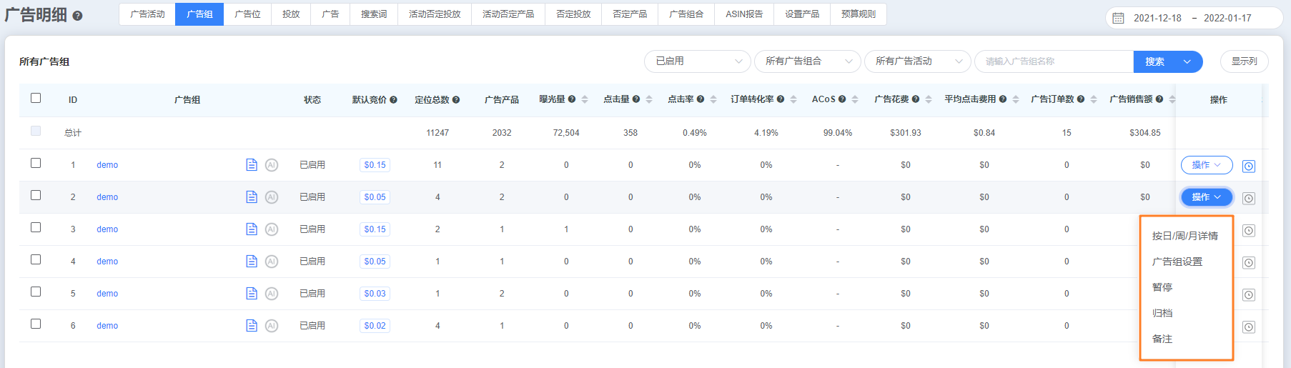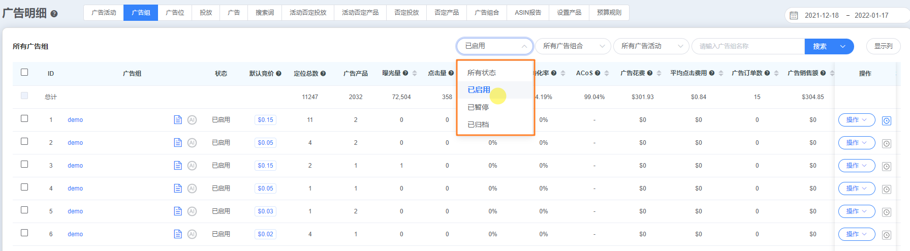 选择“广告组”,系统自动展示用户负责店铺的所有广告组,同时提供各广告组层级的广告KPI、定位投放、广告销售数据等多种详细信息。