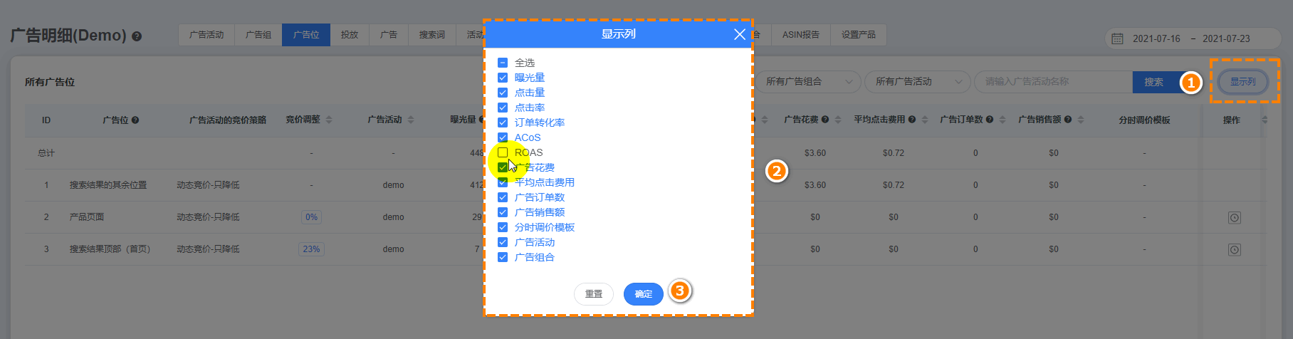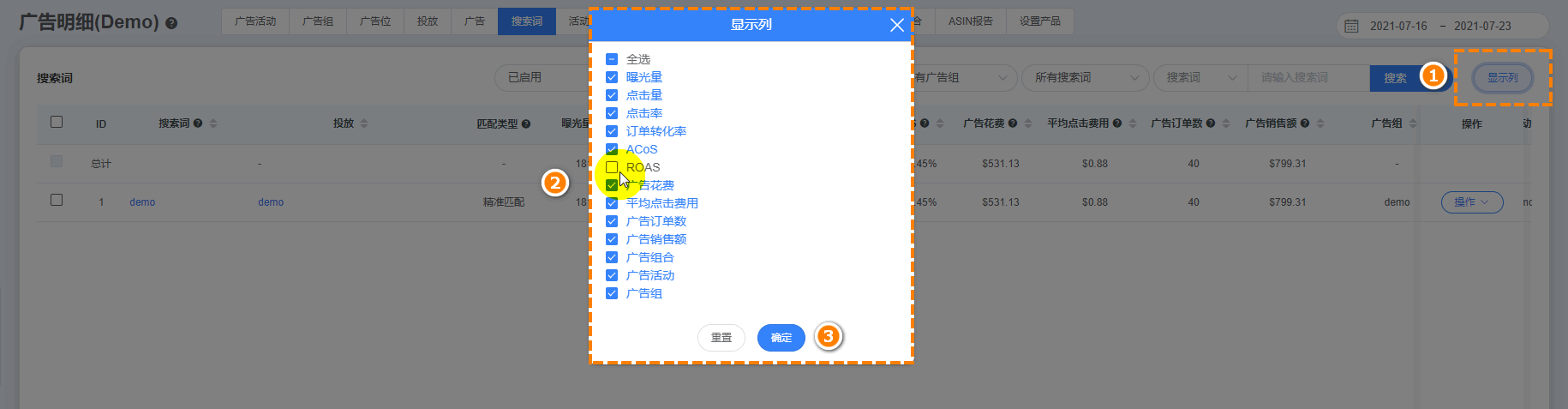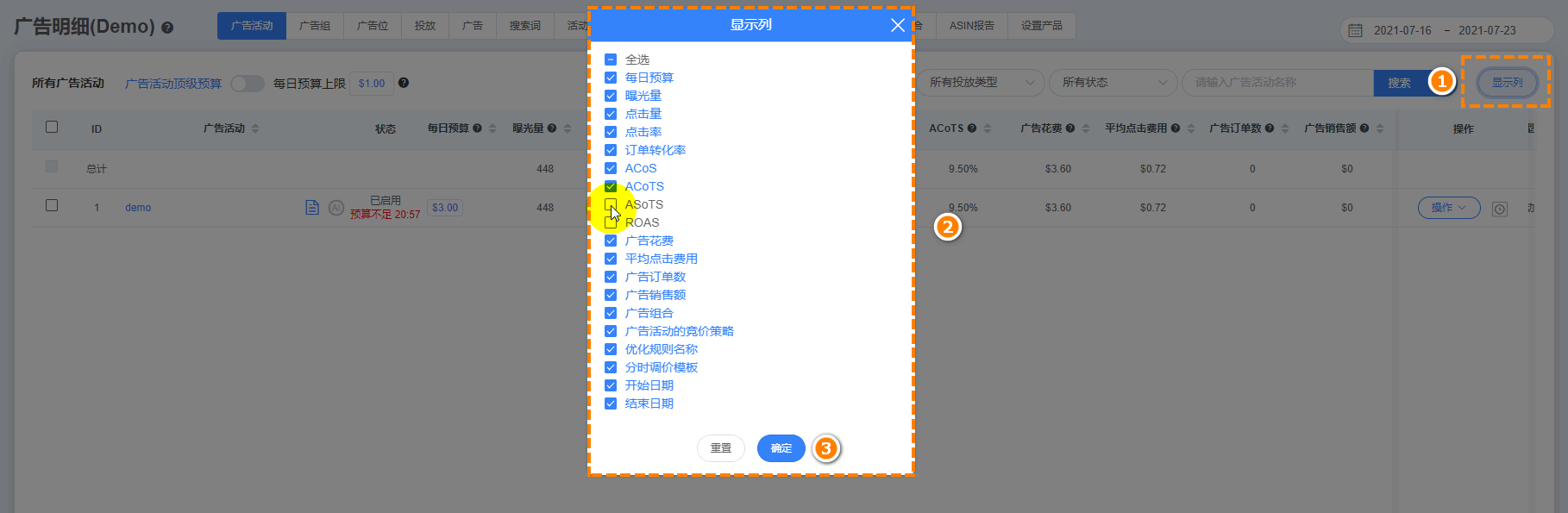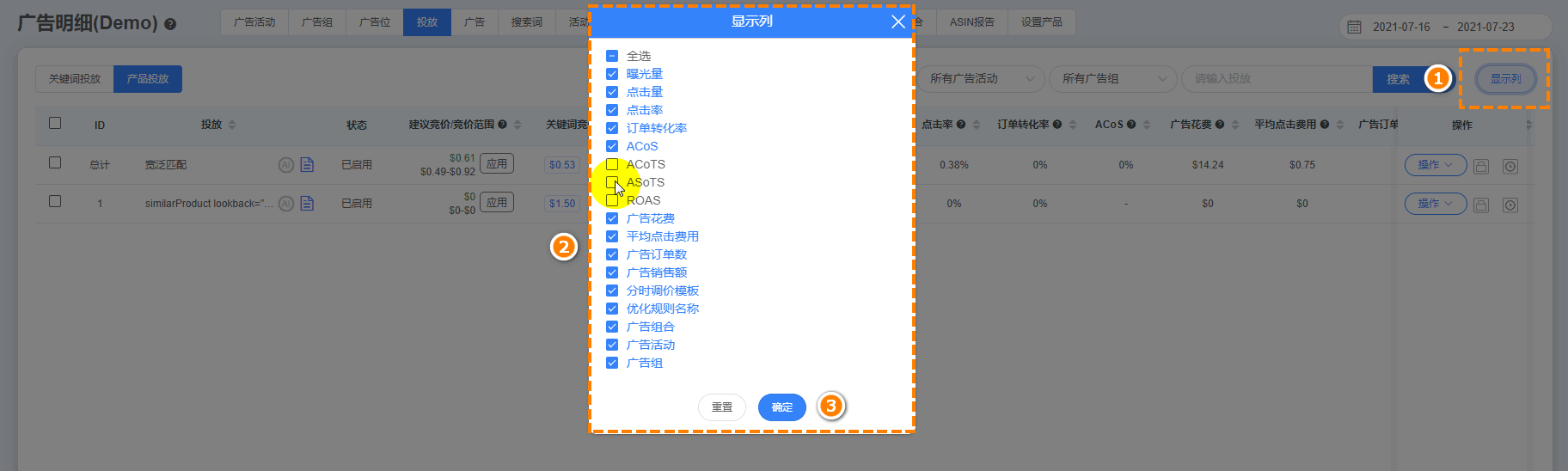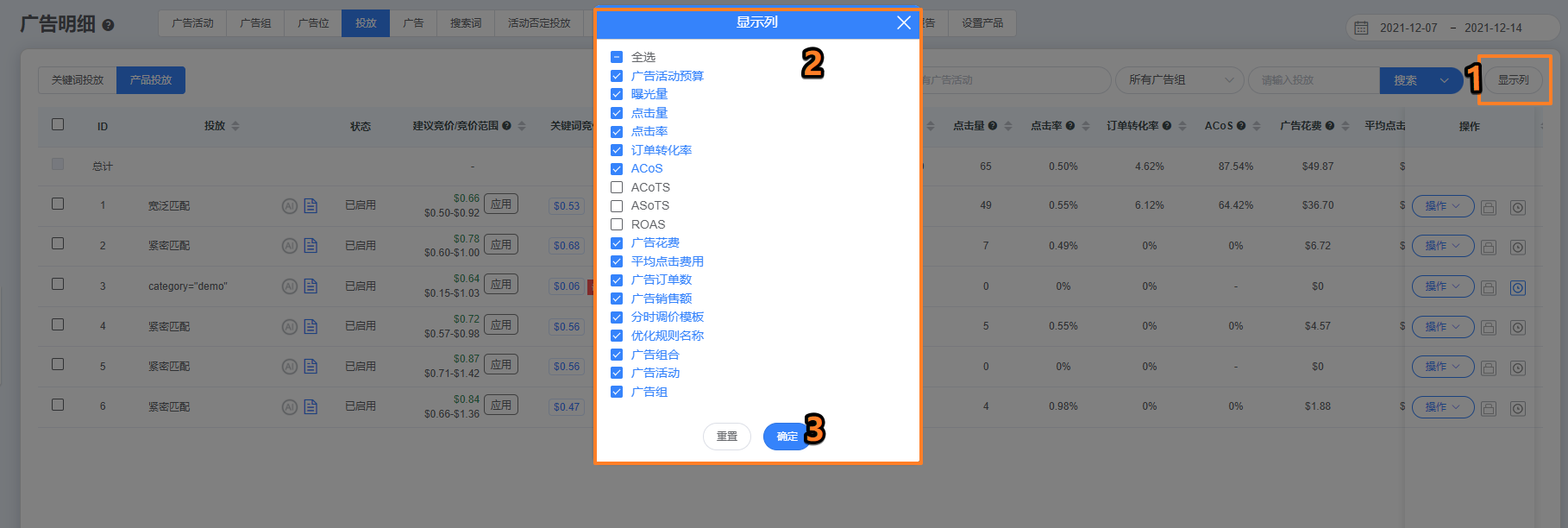 点击右上方“显示列”按钮,用户可自定义展示数据。