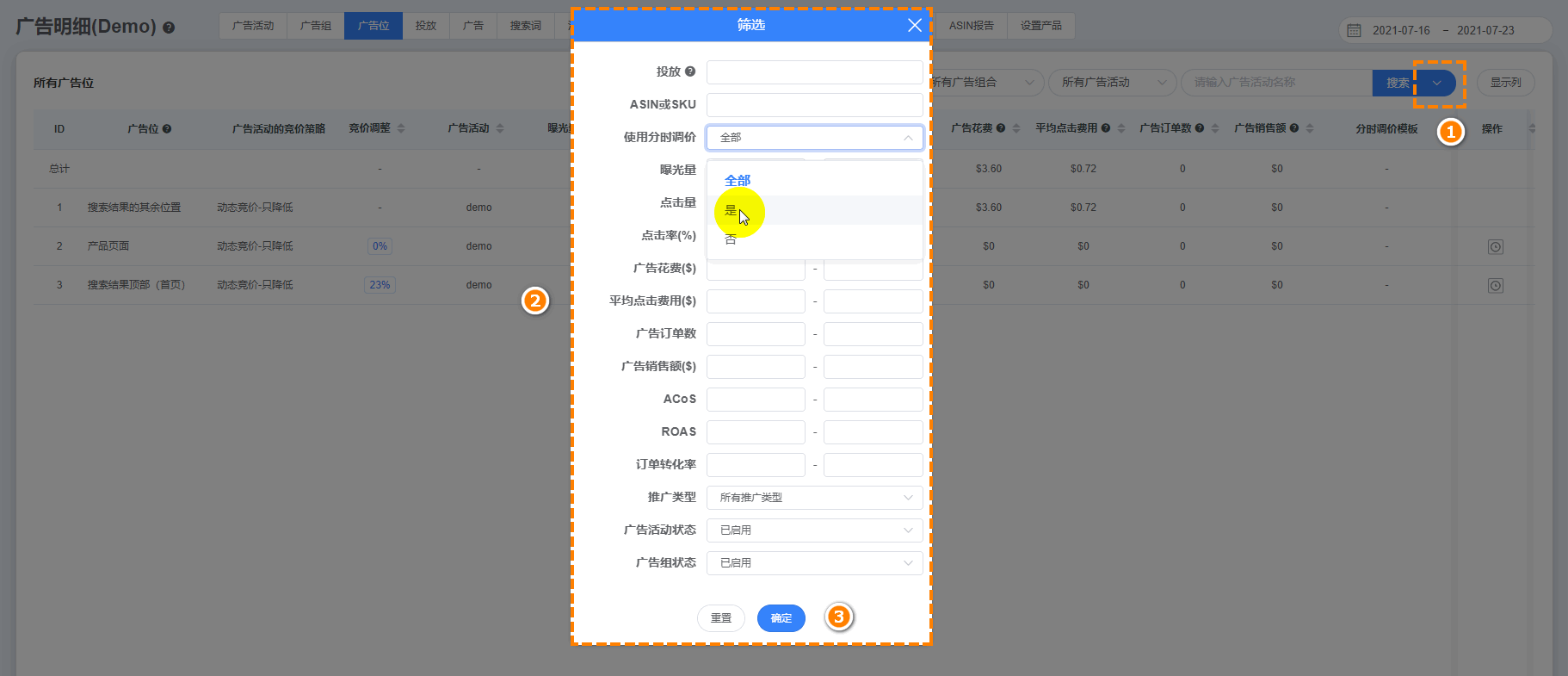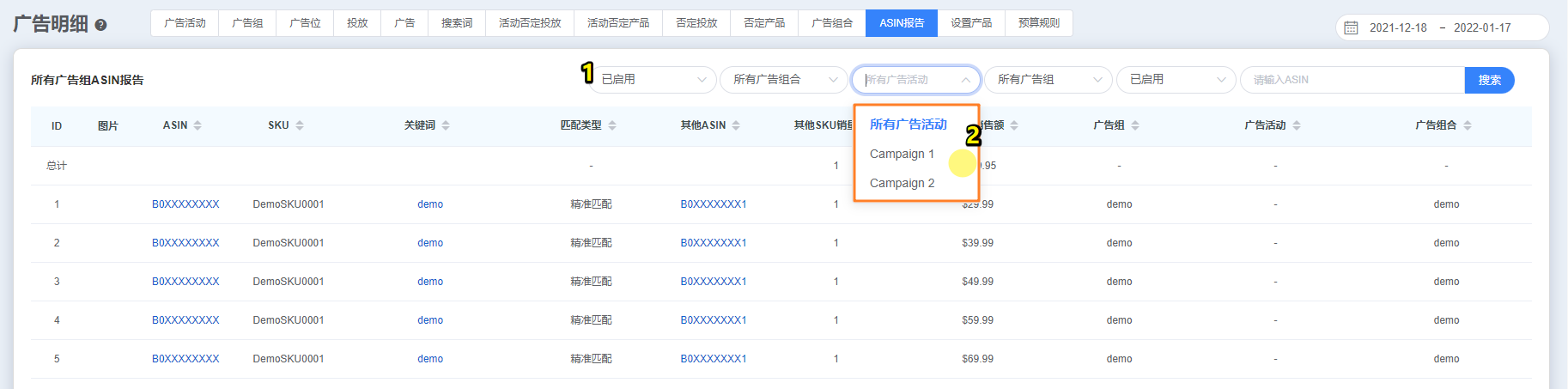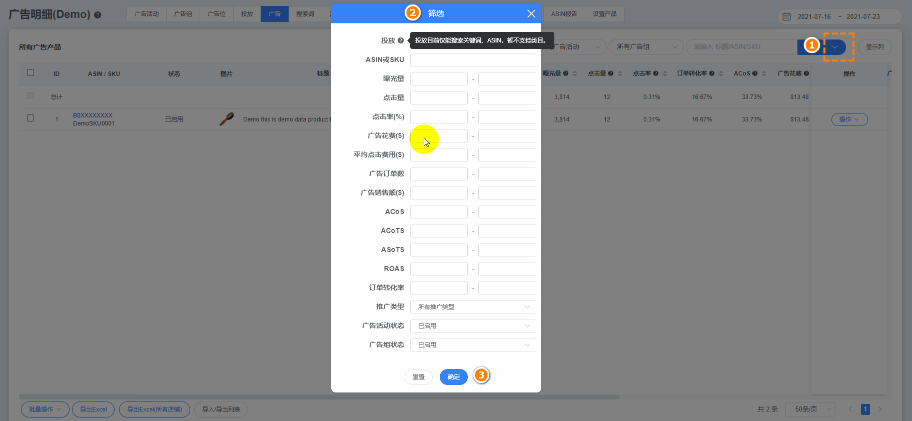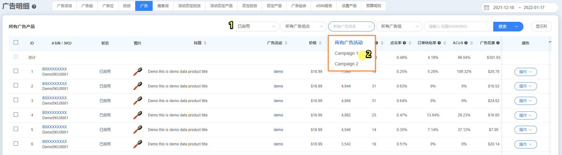 广告层级筛选:选择不同广告层级如广告组合、广告活动、投放状态、产品标题/ASIN/SKU等进行筛选;