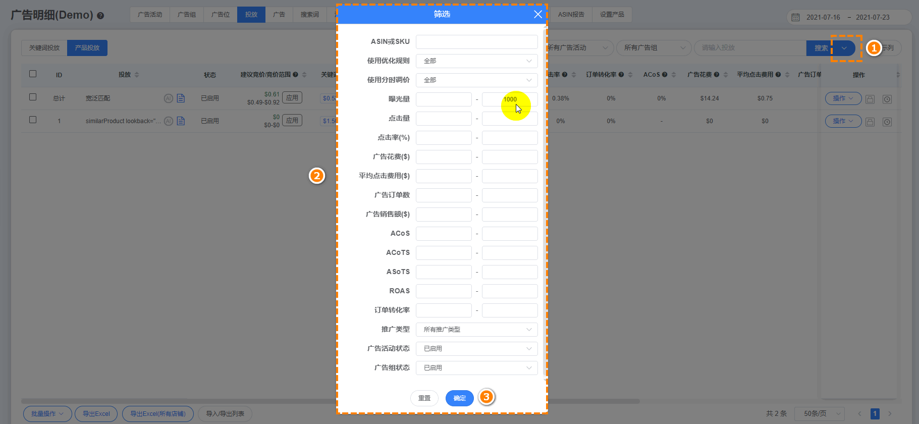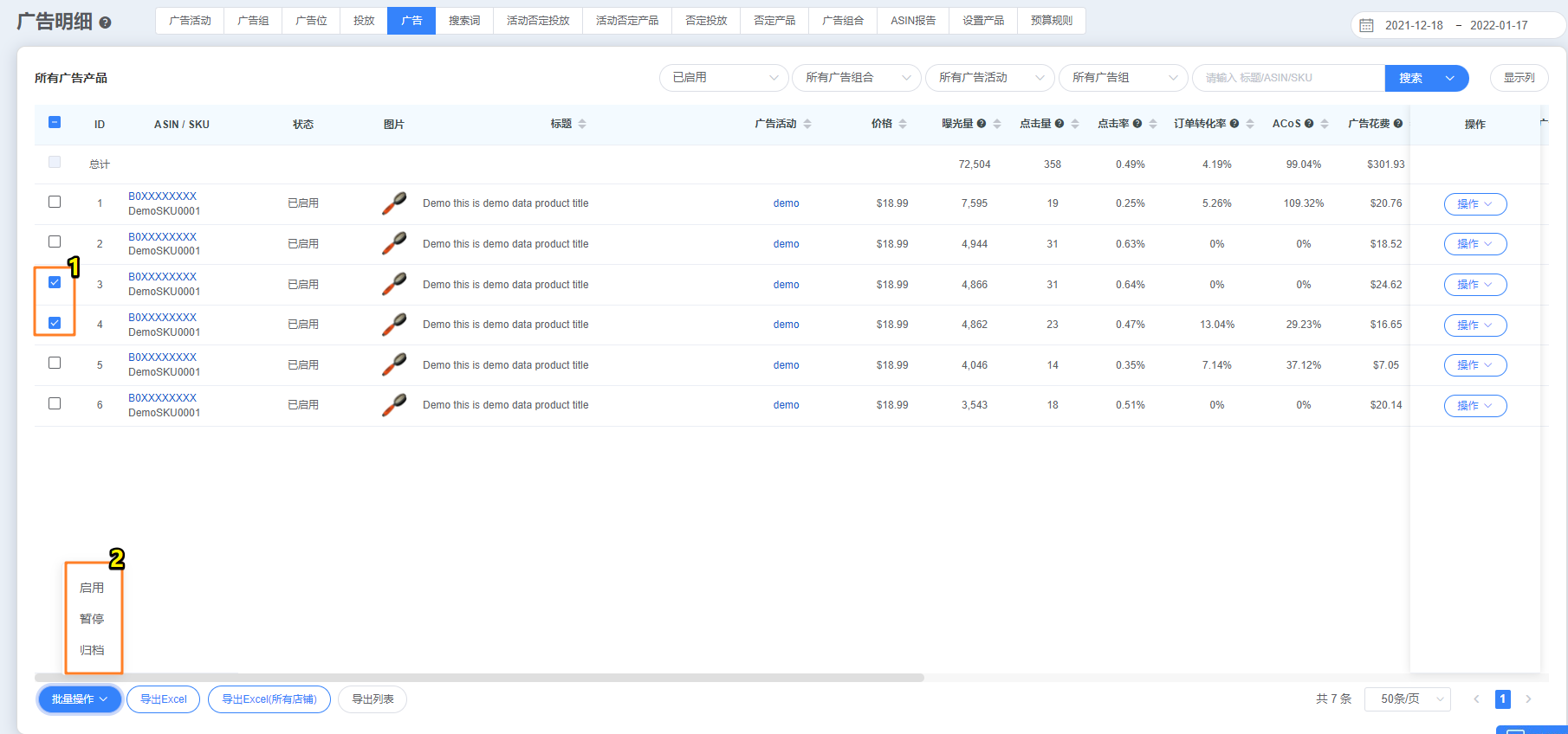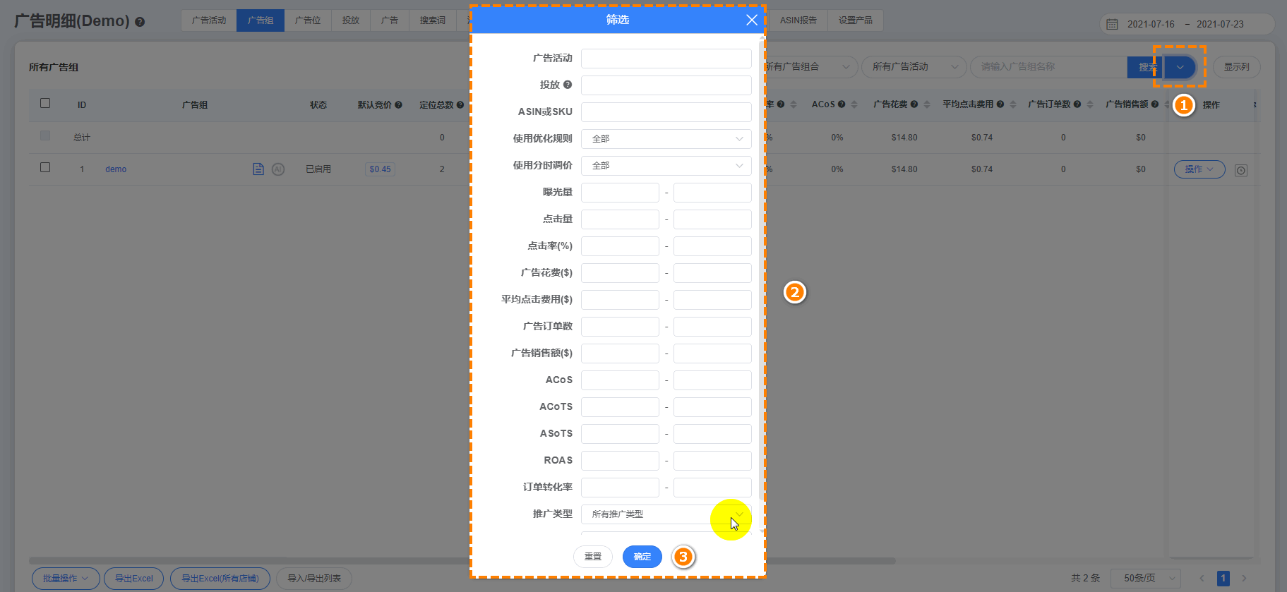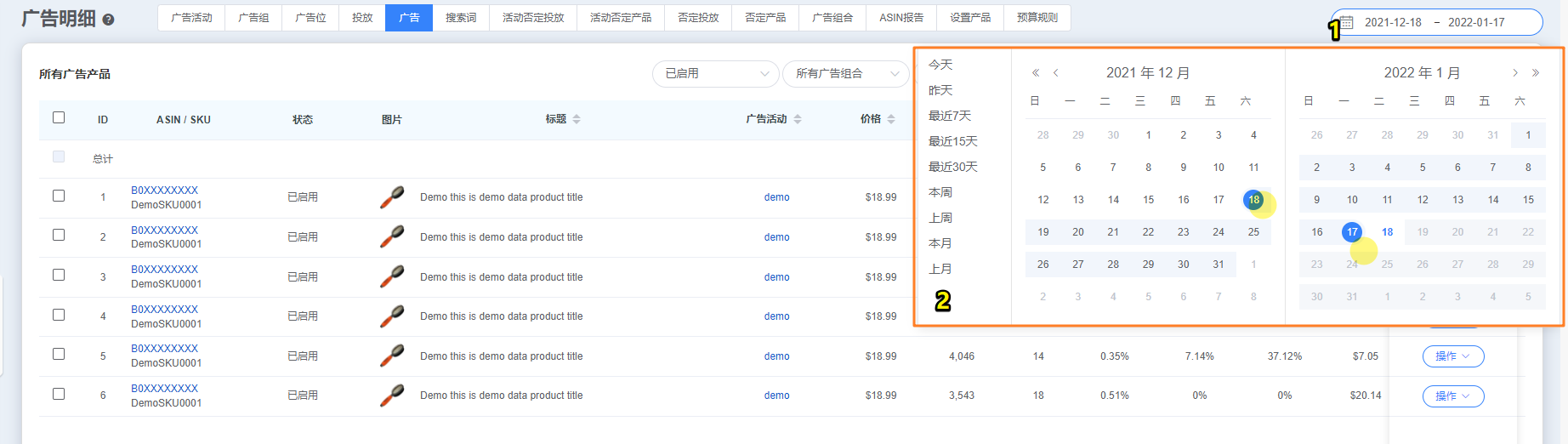广告层级筛选:选择不同广告层级如广告组合、广告活动、投放状态、产品标题/ASIN/SKU等进行筛选;