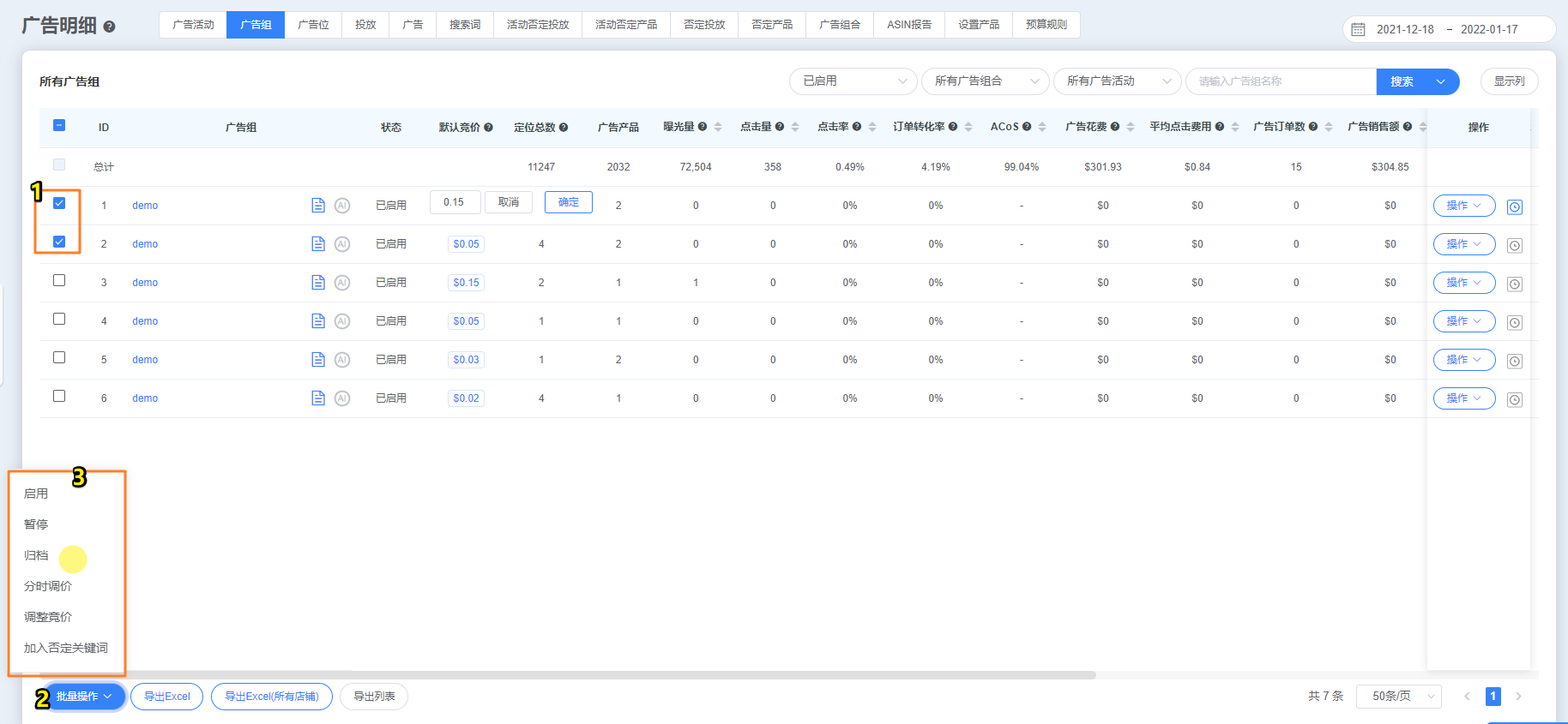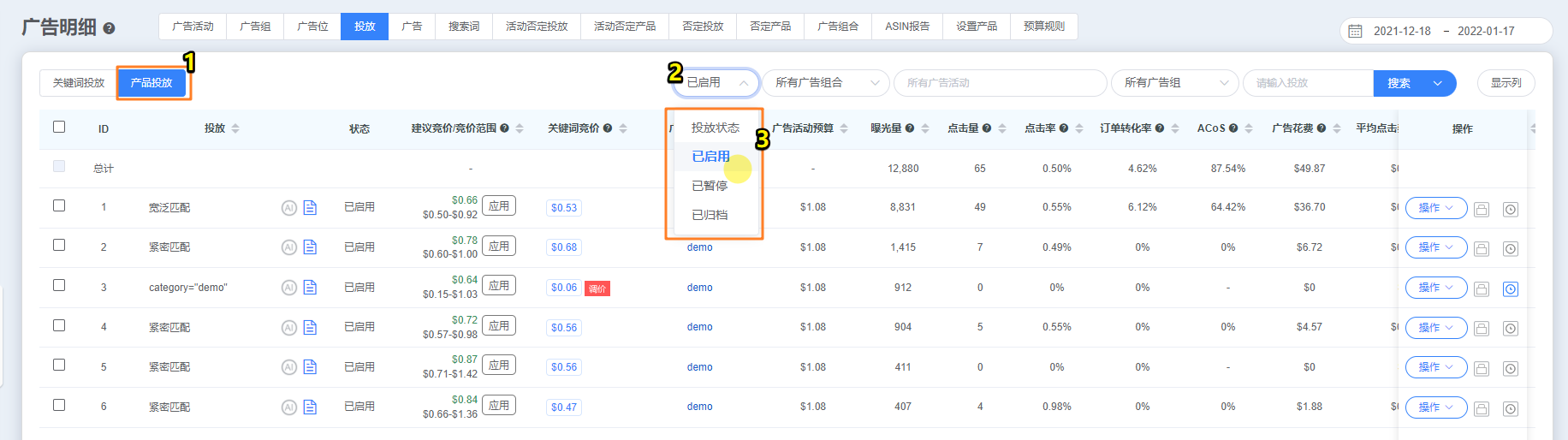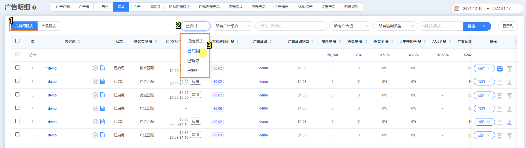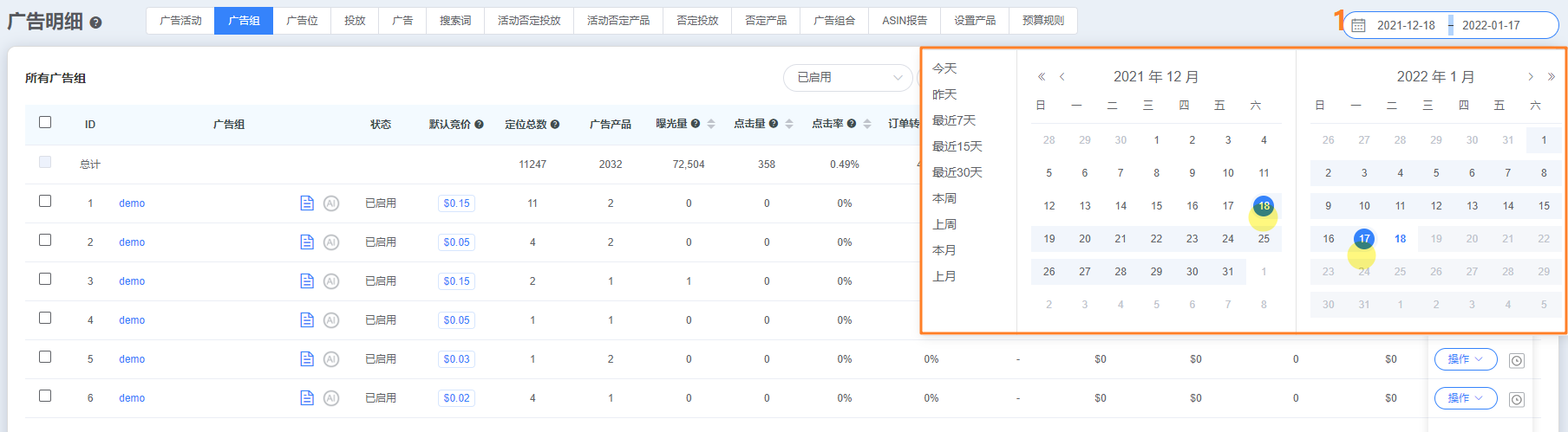 广告层级筛选:选择不同广告层级如广告组合、广告活动、投放状态、产品标题/ASIN/SKU等进行筛选;