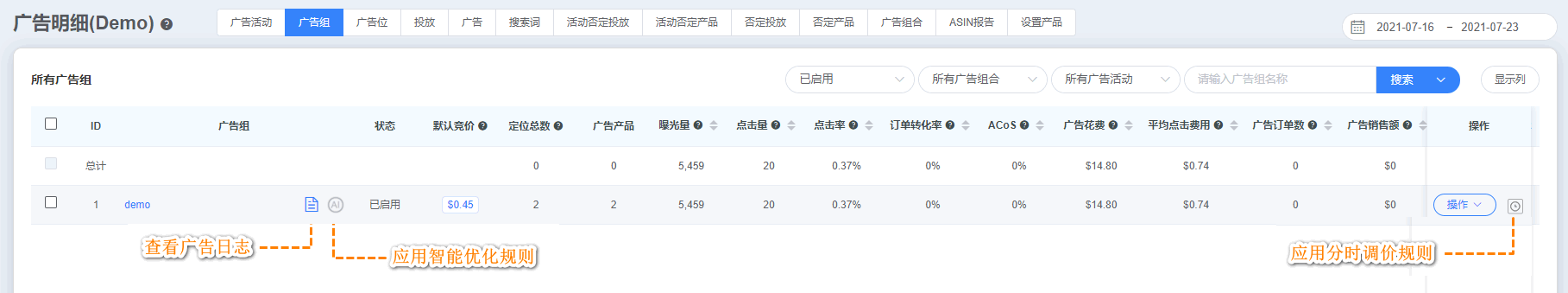 如需为查看广告组对应的广告日志、或为广告组应用“智能优化规则”“分时调价规则”,可点击对应功能图标进行操作。