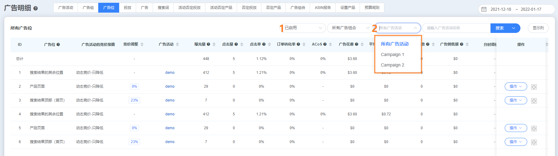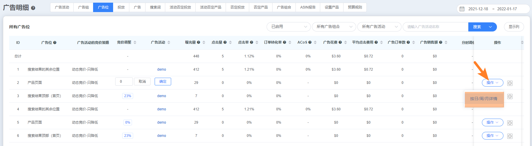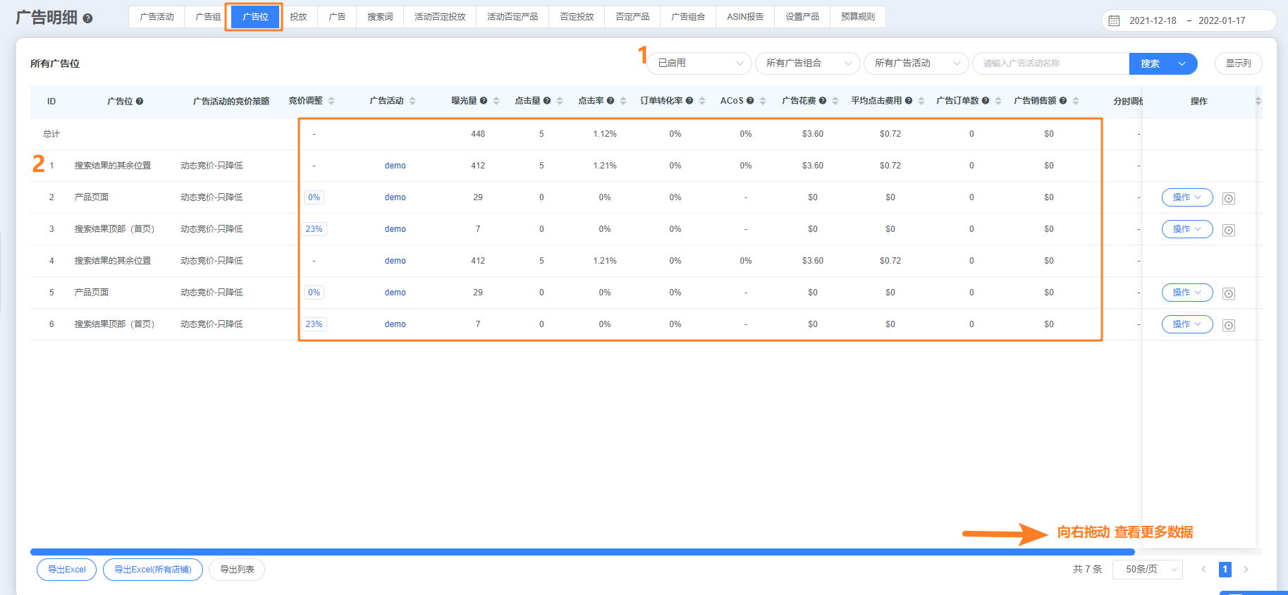 选择“广告位”,系统自动展示用户负责店铺的所有广告活动的广告位数据,包括:搜索结果的其余位置、产品页面与搜索结果顶部(首页),同时提供各广告位的广告KPI、广告销售数据等多种详细信息。