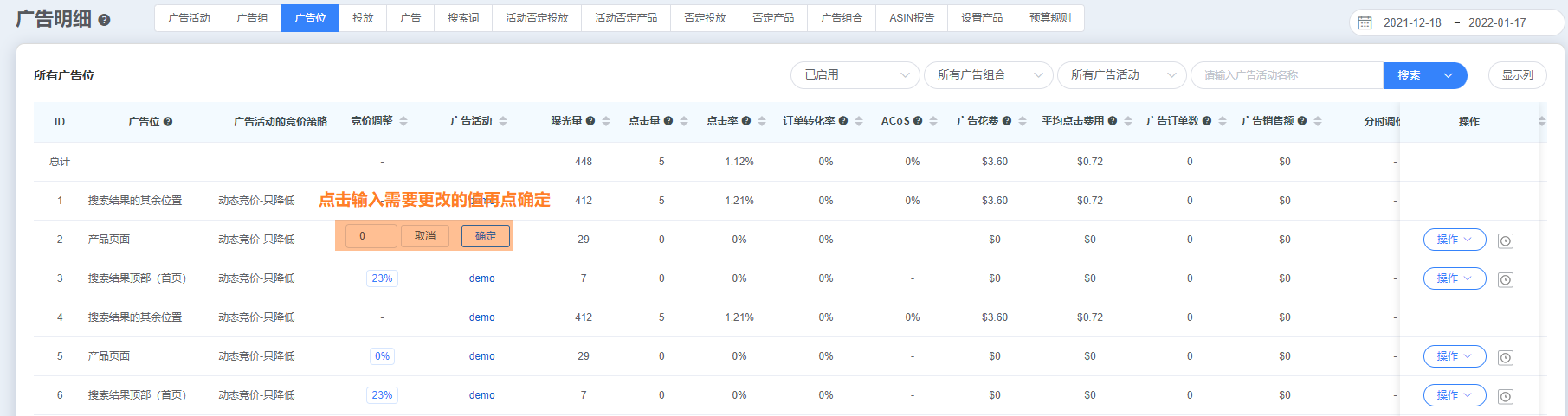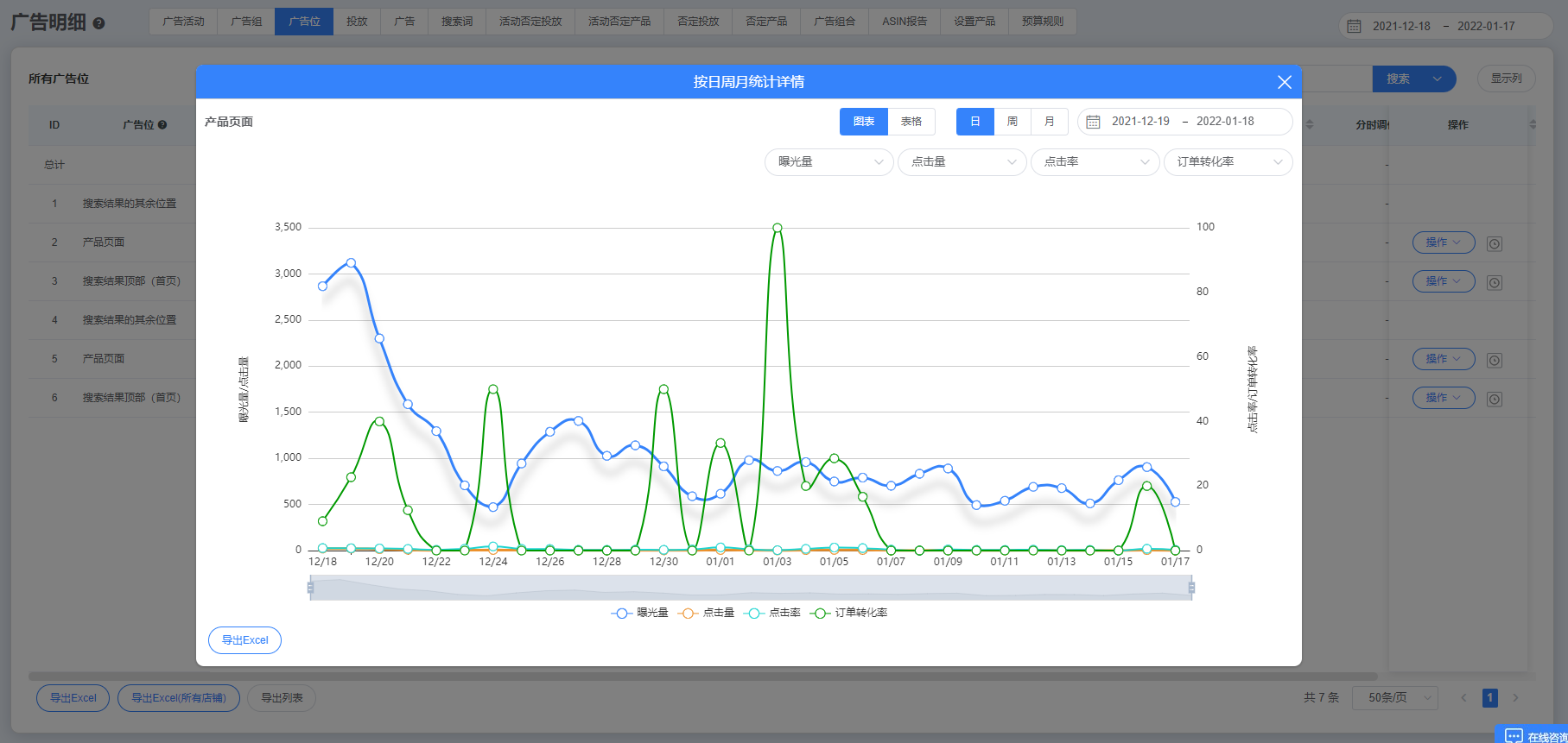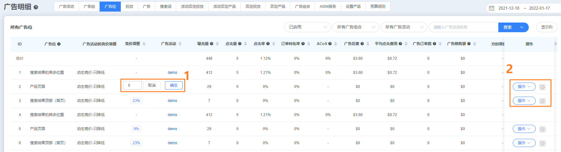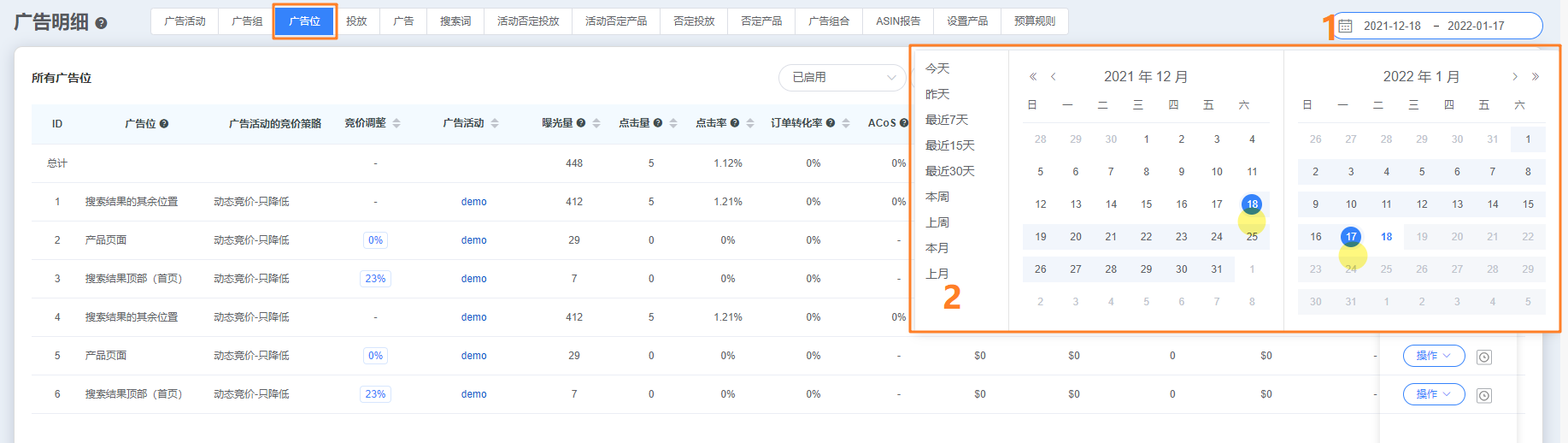 选择“广告位”,系统自动展示用户负责店铺的所有广告活动的广告位数据,包括:搜索结果的其余位置、产品页面与搜索结果顶部(首页),同时提供各广告位的广告KPI、广告销售数据等多种详细信息。