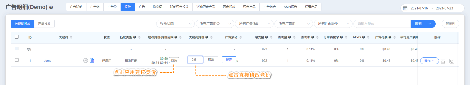如需修改投放竞价,可点击投放关键词或ASIN/类目右侧的竞价框,修改并确认;或直接应用左侧来自亚马逊API接口的建议竞价。