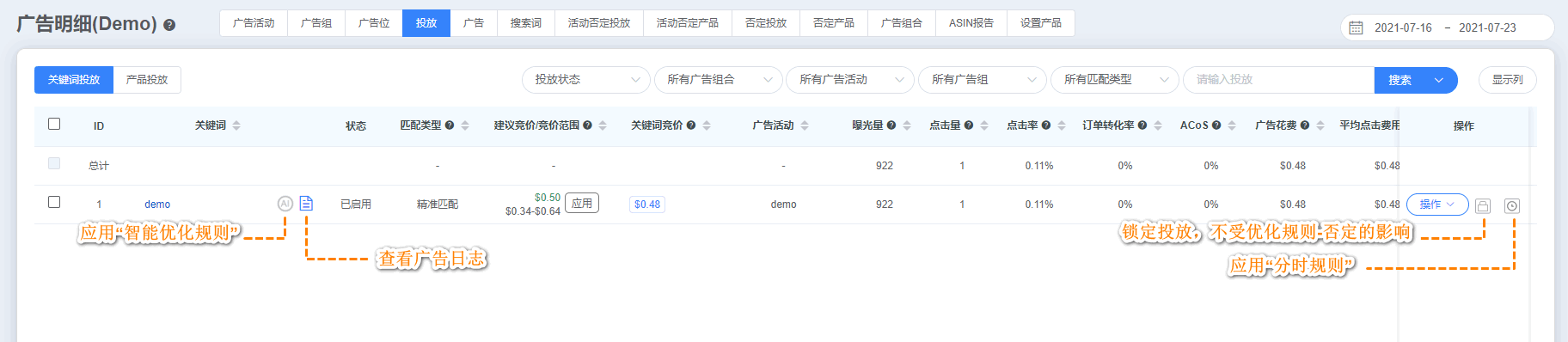 如需查看投放项对应的广告日志、或为广告活动应用“智能优化规则”“分时调价规则”,可点击对应功能图标进行操作。