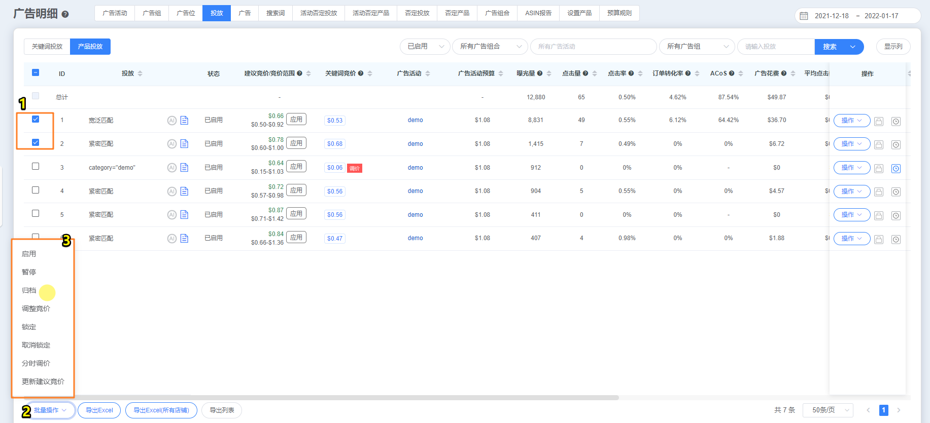 如需进行批量操作,可勾选多个投放ASIN,点击左下方的“批量操作”选项,选择对应操作。