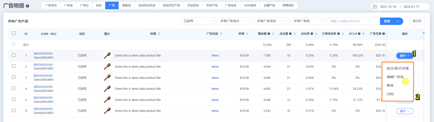 如需暂停、归档广告ASIN,或增加广告组投放ASIN,点击“操作”,选择对应选项即可。