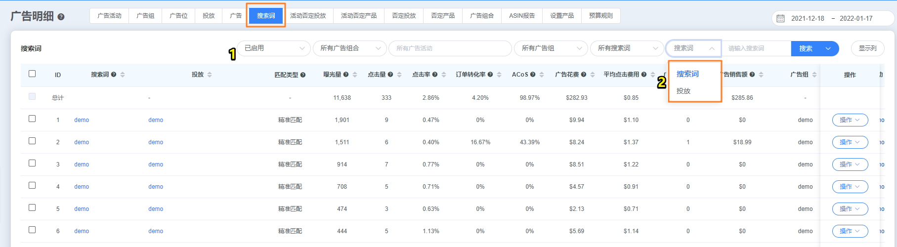 广告层级筛选:选择不同广告层级如广告组合、广告活动、广告组、投放状态、具体投放或搜索词等进行筛选;