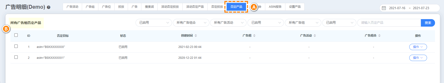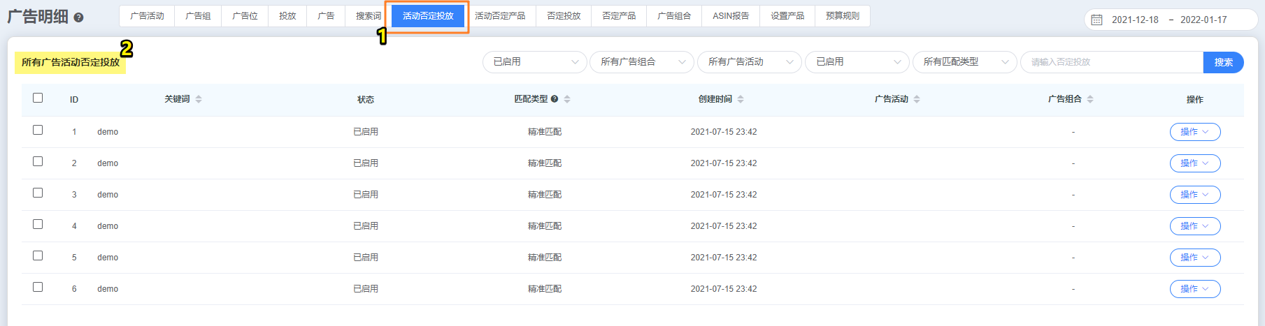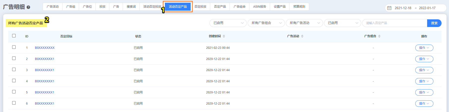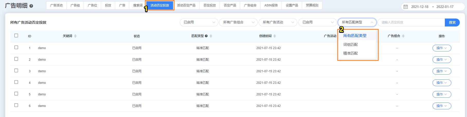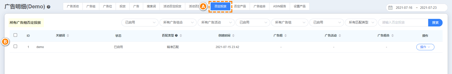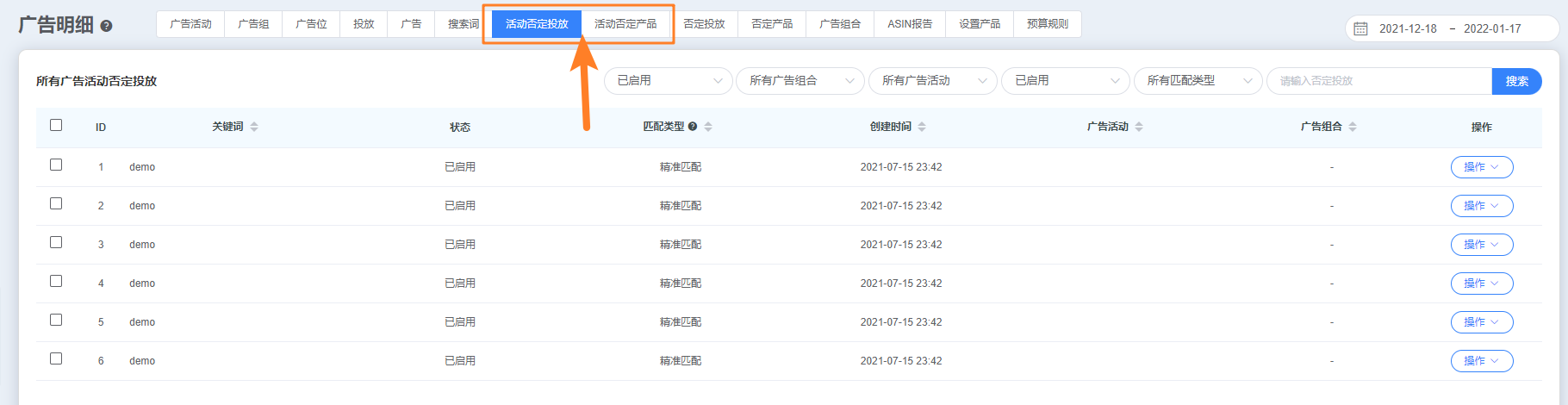 选择“活动否定投放”或“活动否定产品”,系统自动展示用户负责店铺的所有广告活动的否定关键词与否定ASIN,同时提供否定层级信息。
