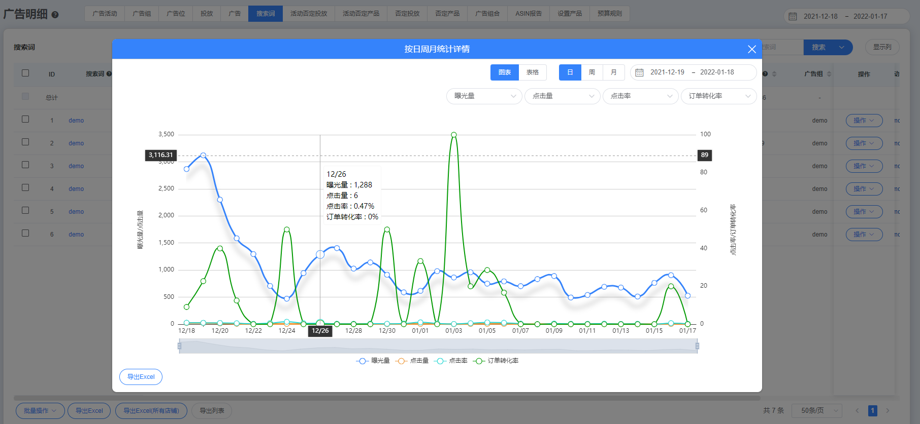 点击操作按钮,选择“按日/周/月详情查看数据”