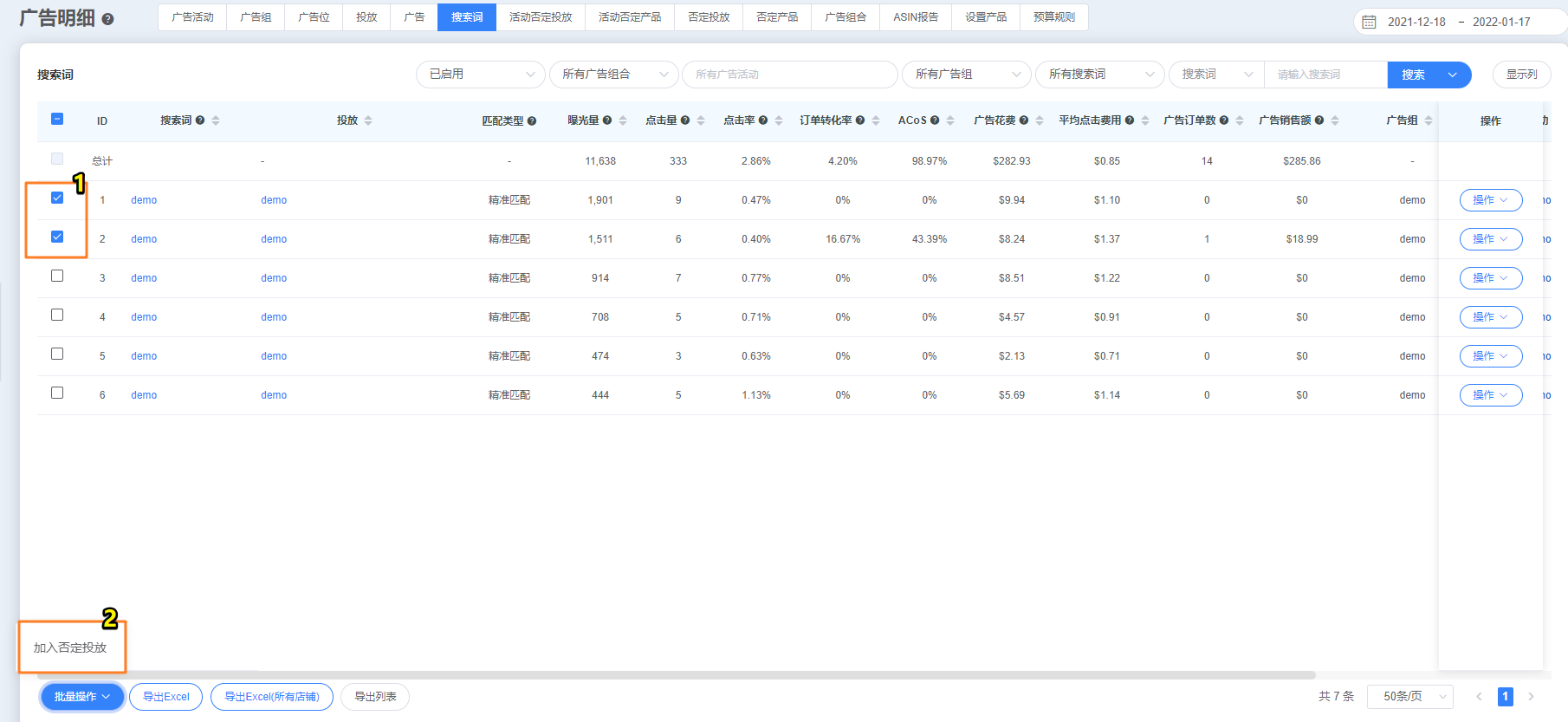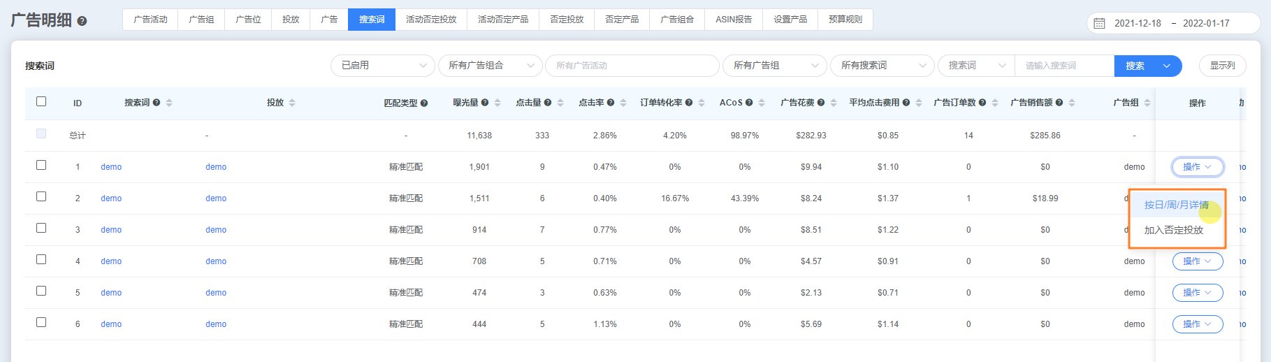 如需否定搜索内容如搜索-关键词、搜索-ASIN,可点击搜索内容右侧的“操作”,选择“加入否定投放”即可。