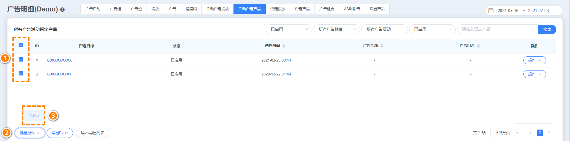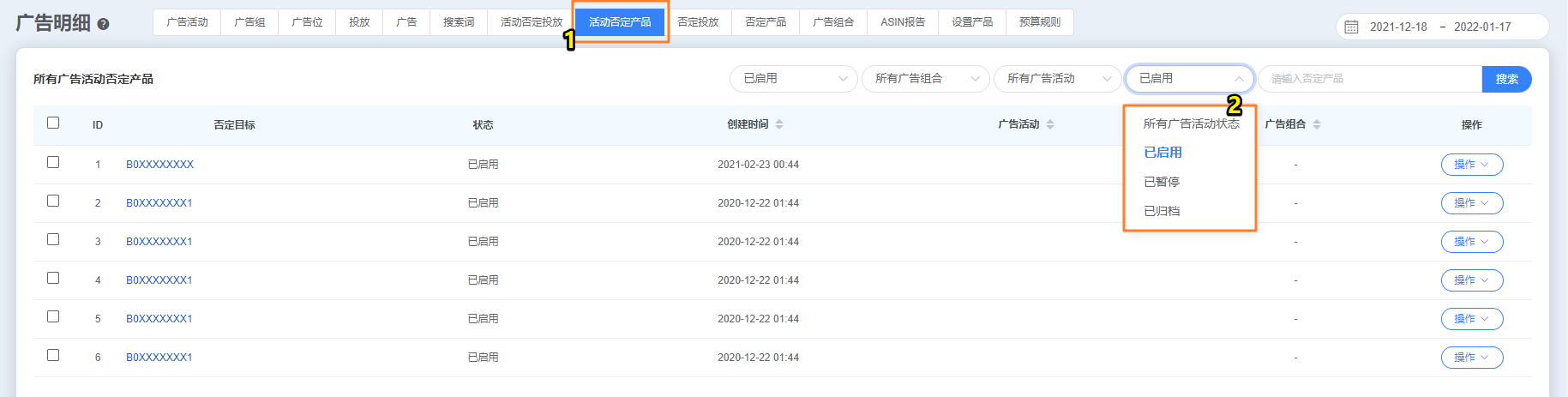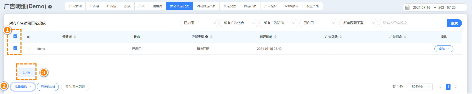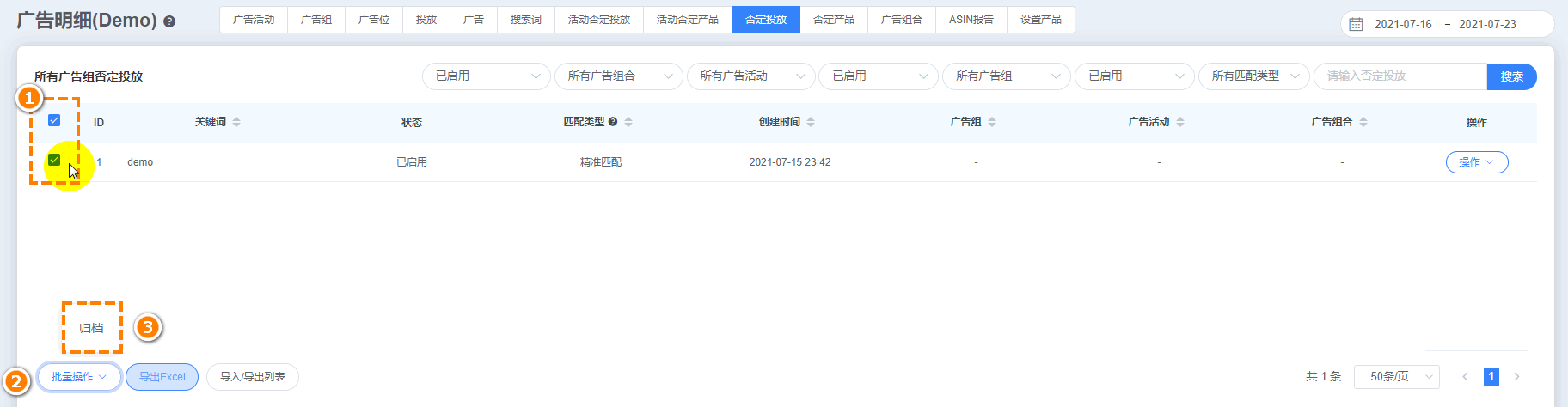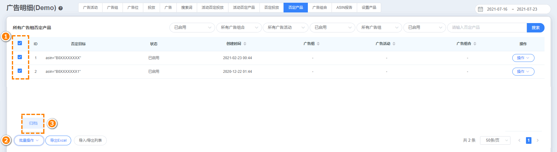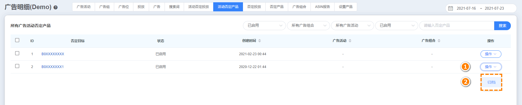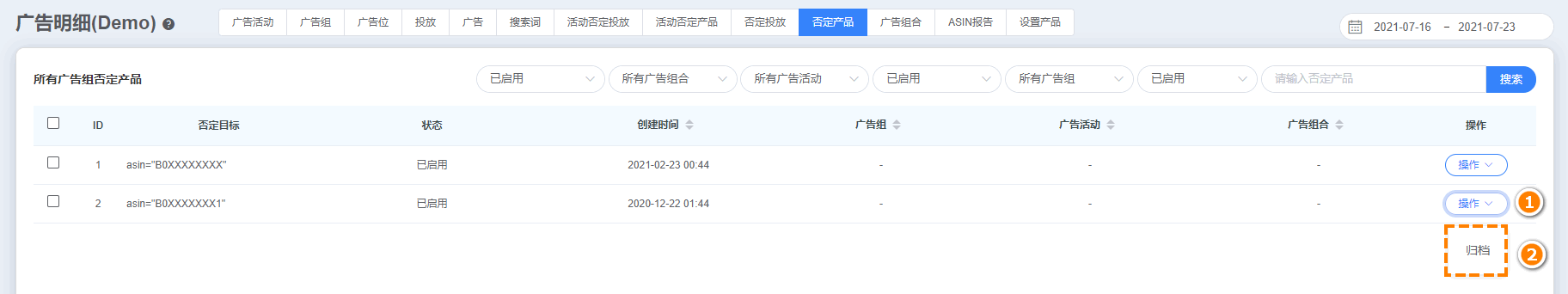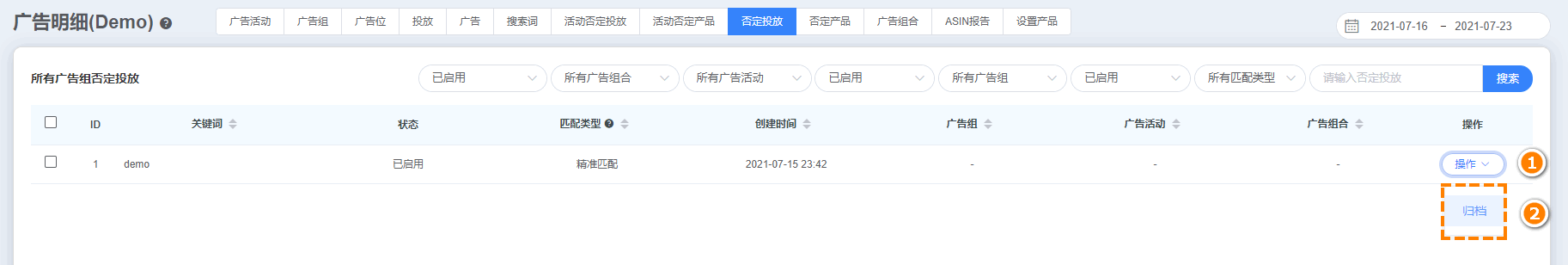 如需归档广告组的已否定关键词/ASIN,可分别点击搜索内容右侧的“操作”,选择“归档”即可。