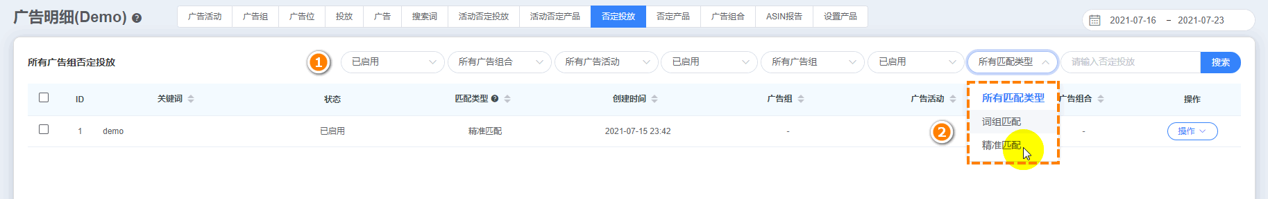 广告层级筛选:选择不同广告层级如广告组合、广告活动、否定状态、具体否定内容等进行筛选