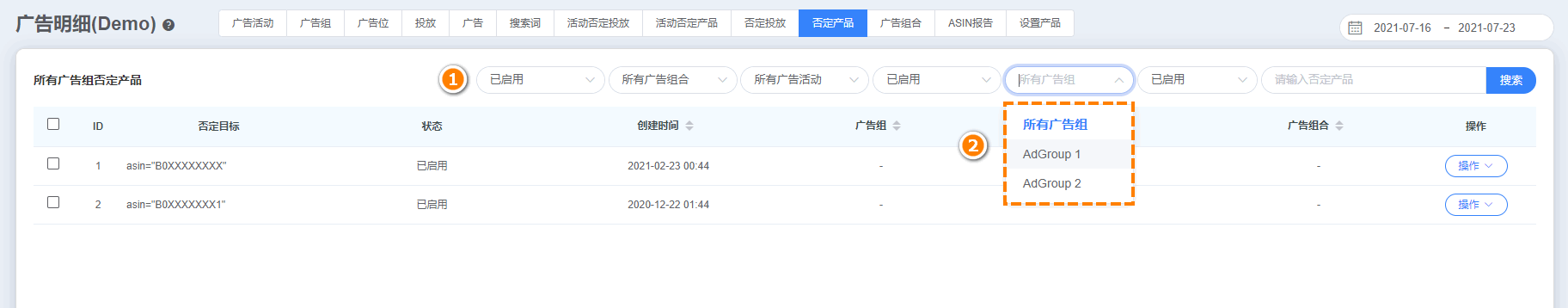 选择“广告组否定投放”或“广告组否定产品”,系统自动展示用户负责店铺的所有广告组层级的否定关键词与否定ASIN,同时提供否定层级信息。