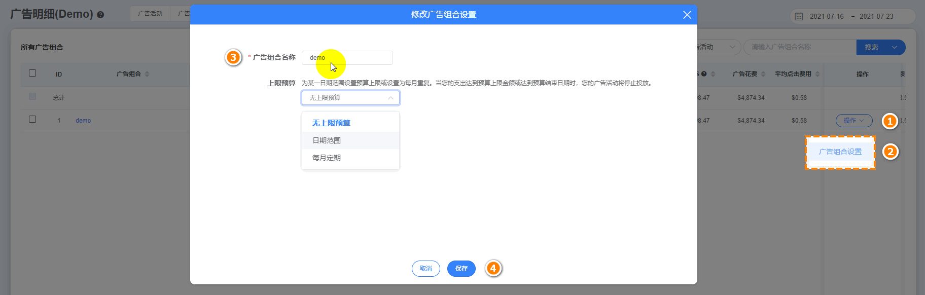 如需修改广告组合设置,如广告组合名称、广告组合预算,可分别点击搜索内容右侧的“操作”,选择“广告组合设置”进行修改。
