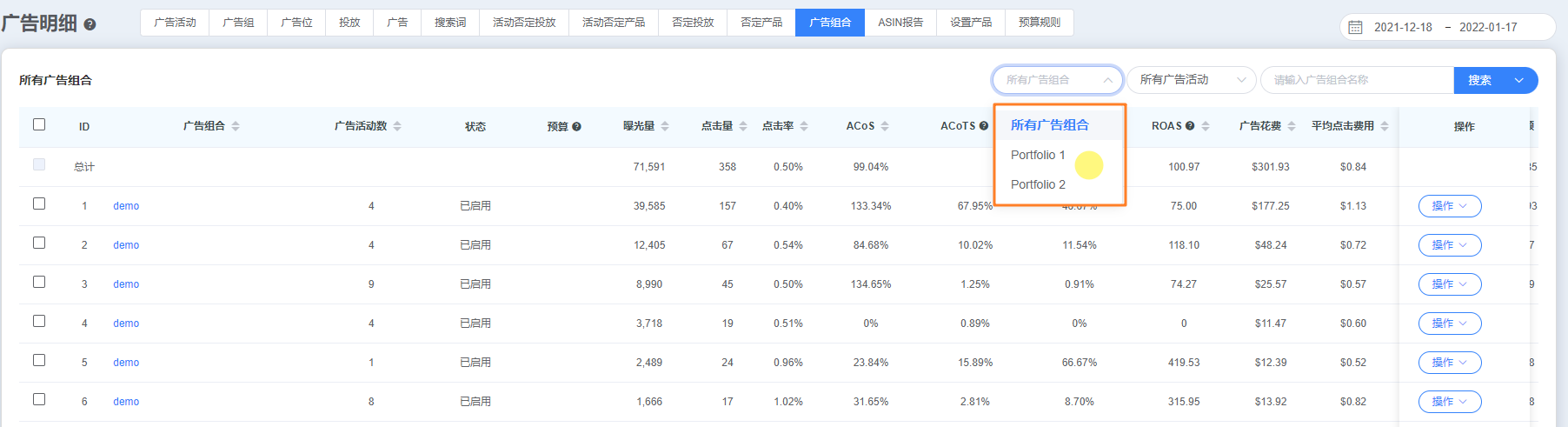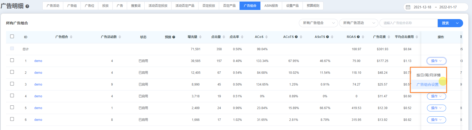 选择“广告组合”,系统自动展示用户负责店铺的所有广告组合信息,提供包括广告活动数、预算、整体广告KPI、广告销售数据、广告设置等多种详细数据。