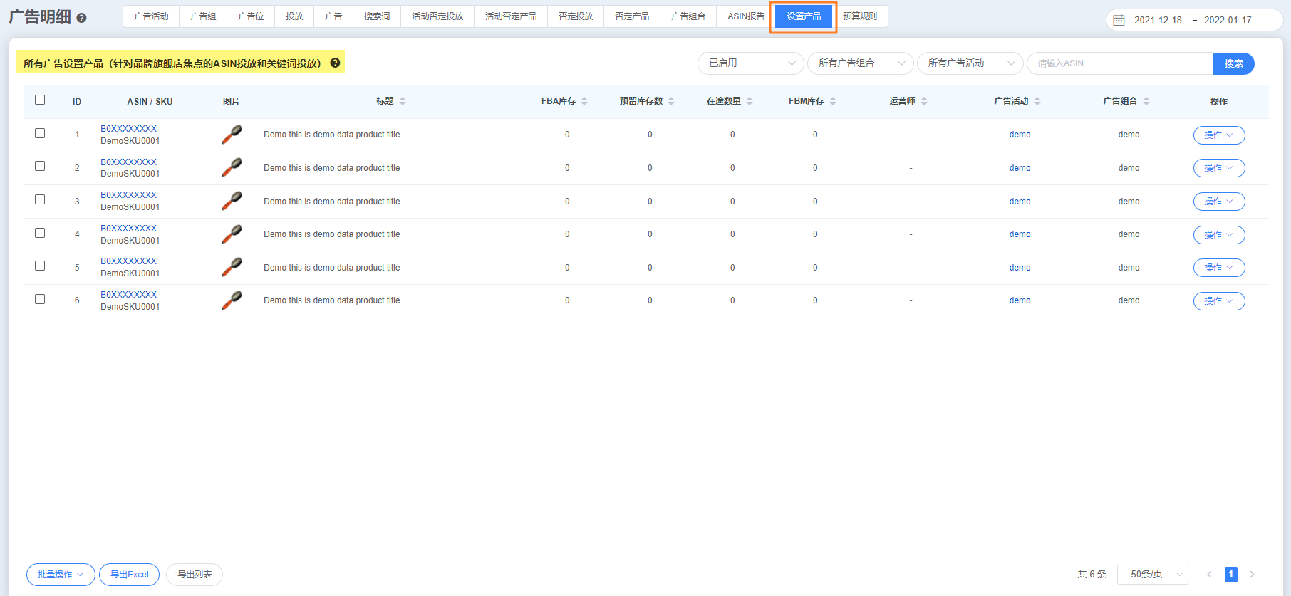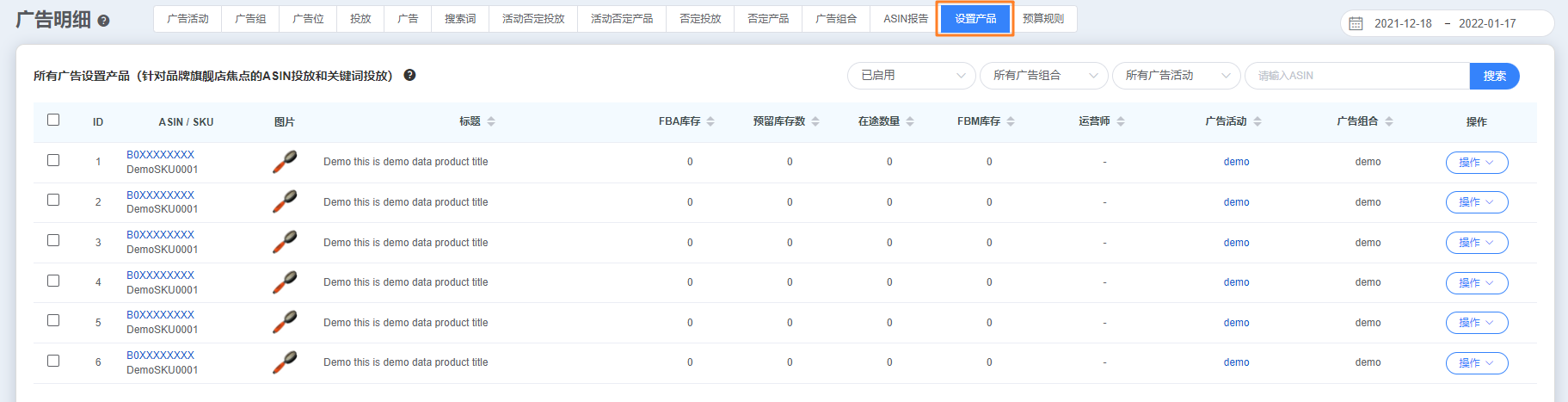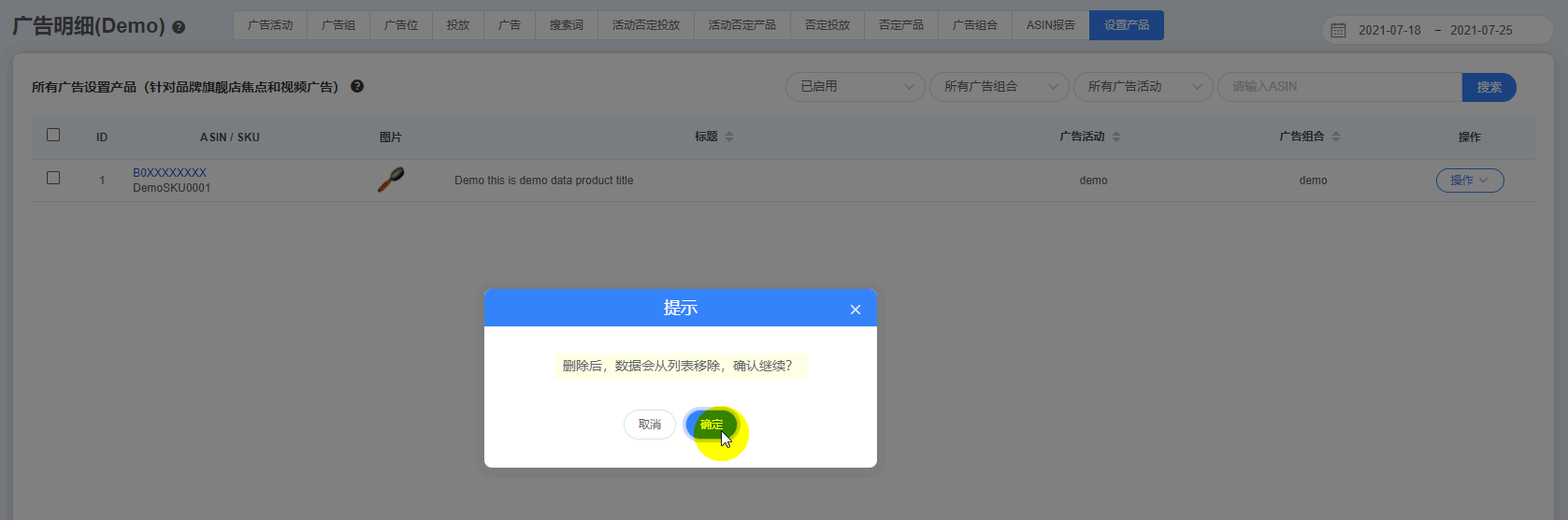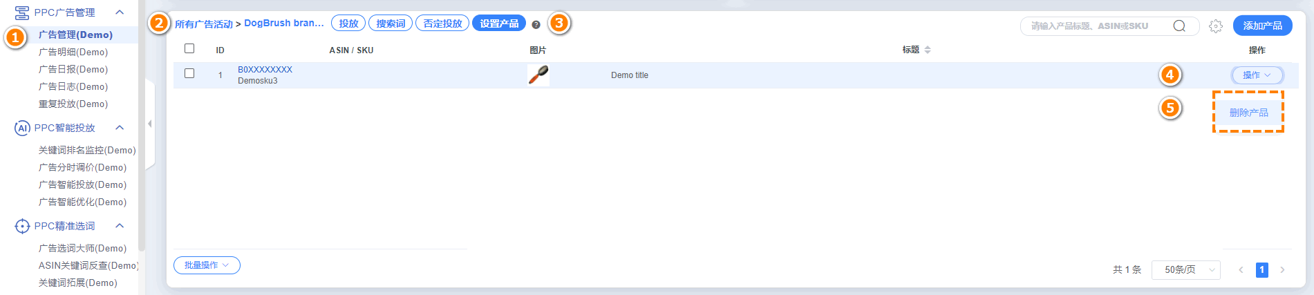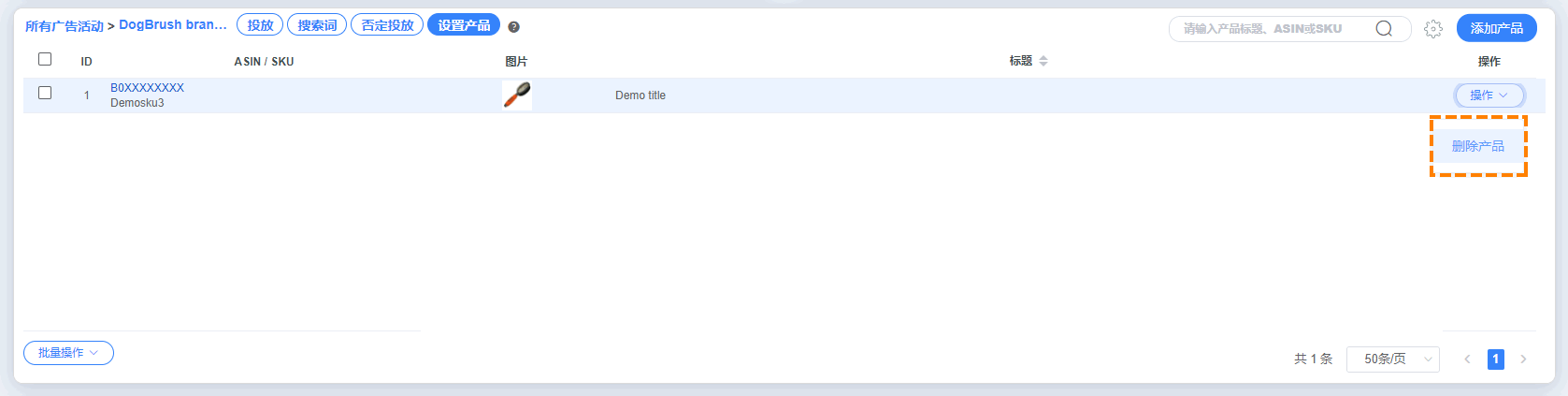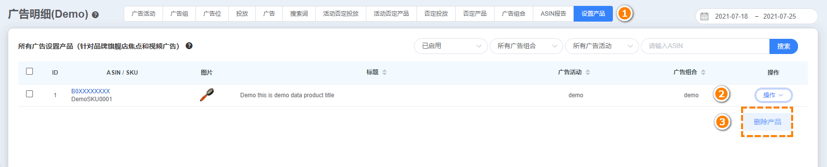 广告明细>产品设置:选择需删除ASIN,点击“操作-删除”即可