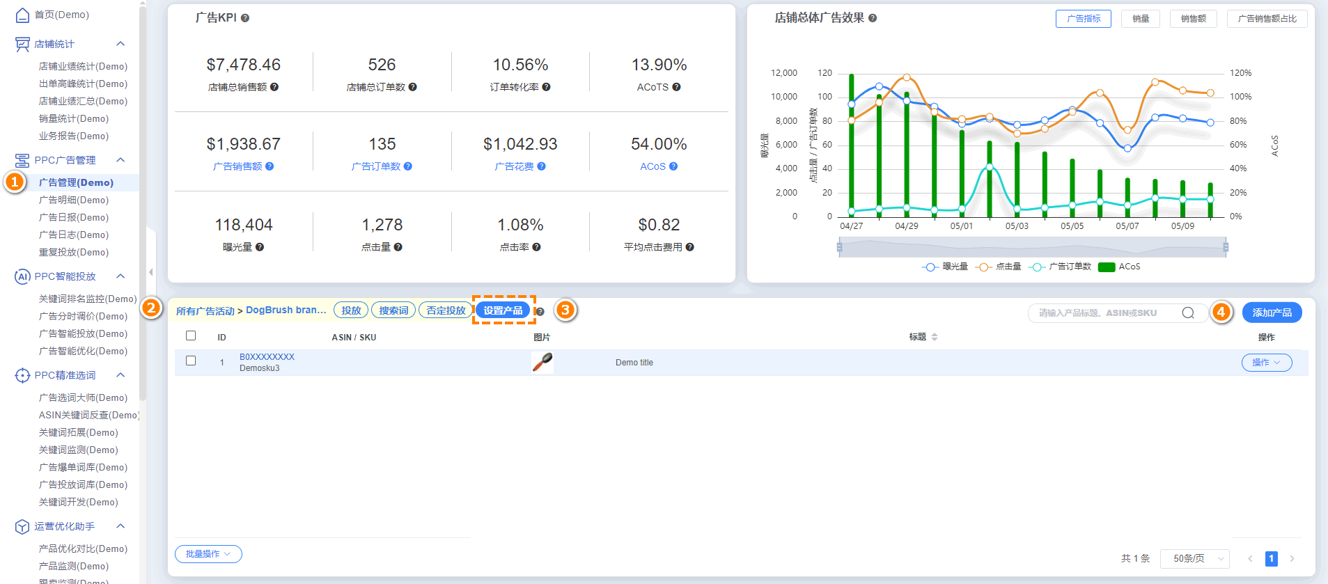 如果主账号进行【产品设置】的关联,管理被关联ASIN的子账号用户在【广告管理】功能也能同步看到这些品牌广告和具体产品
