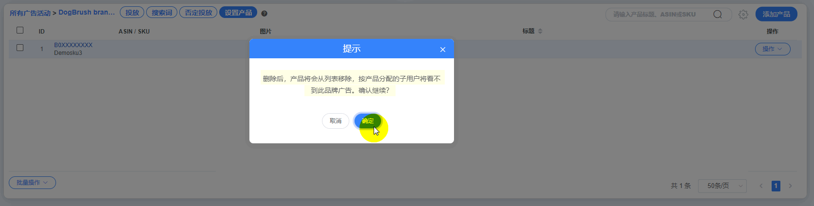 如果主账号进行【产品设置】的删除,管理被删除关联ASIN的子账号用户在【广告管理】功能将不能看到对应的品牌广告与具体产品