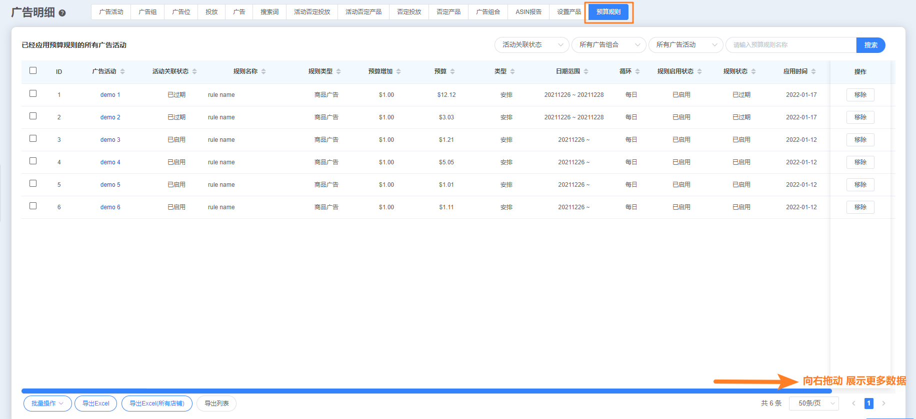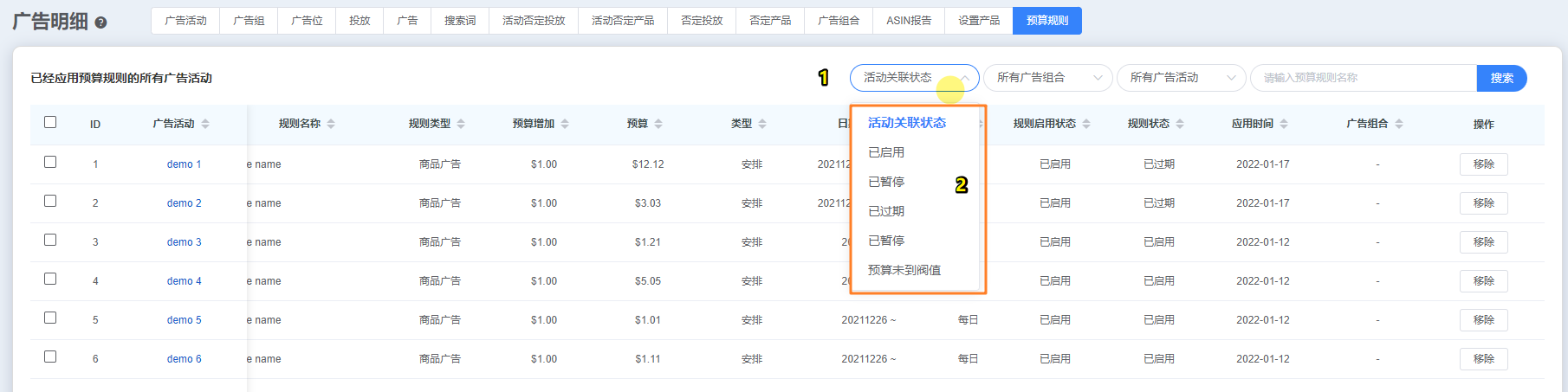 选择“预算规则”,系统自动展示用户负责店铺的所有应用了预算规则的广告活动,提供包括活动关联状态、规则名称/类型、预算增加、预算、类型、日期范围、循环、规则启用状态、规则状态、应用时间、广告组合等数据