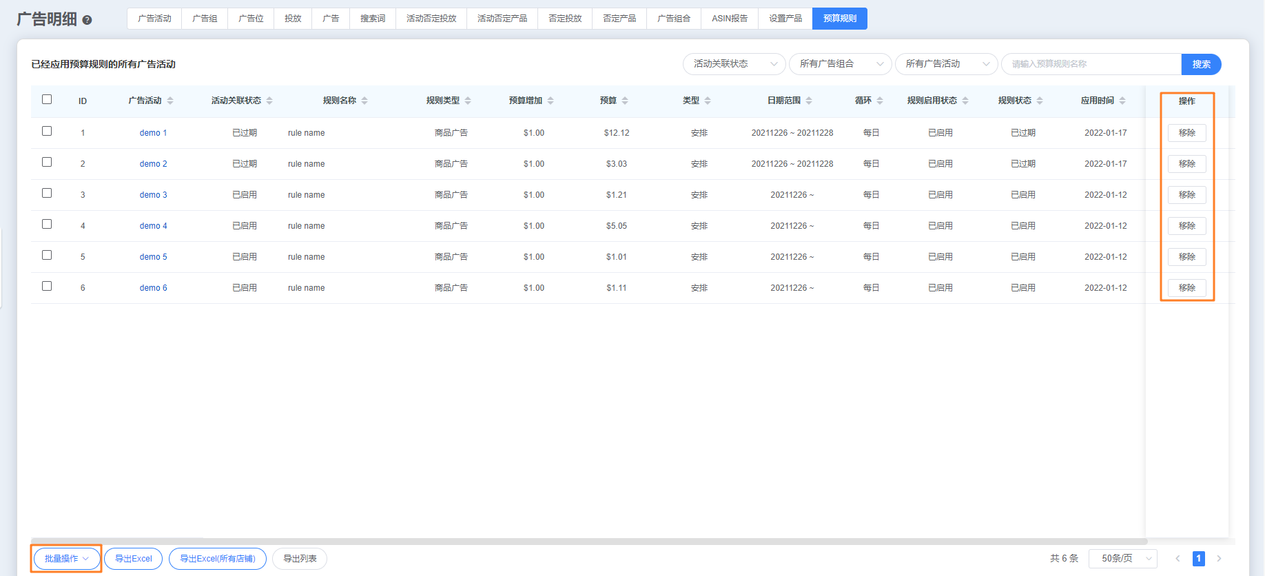 选择需要移除预算规则的广告活动,点击操作下的移除,还可以勾选广告活动点击左下角的批量操作移除