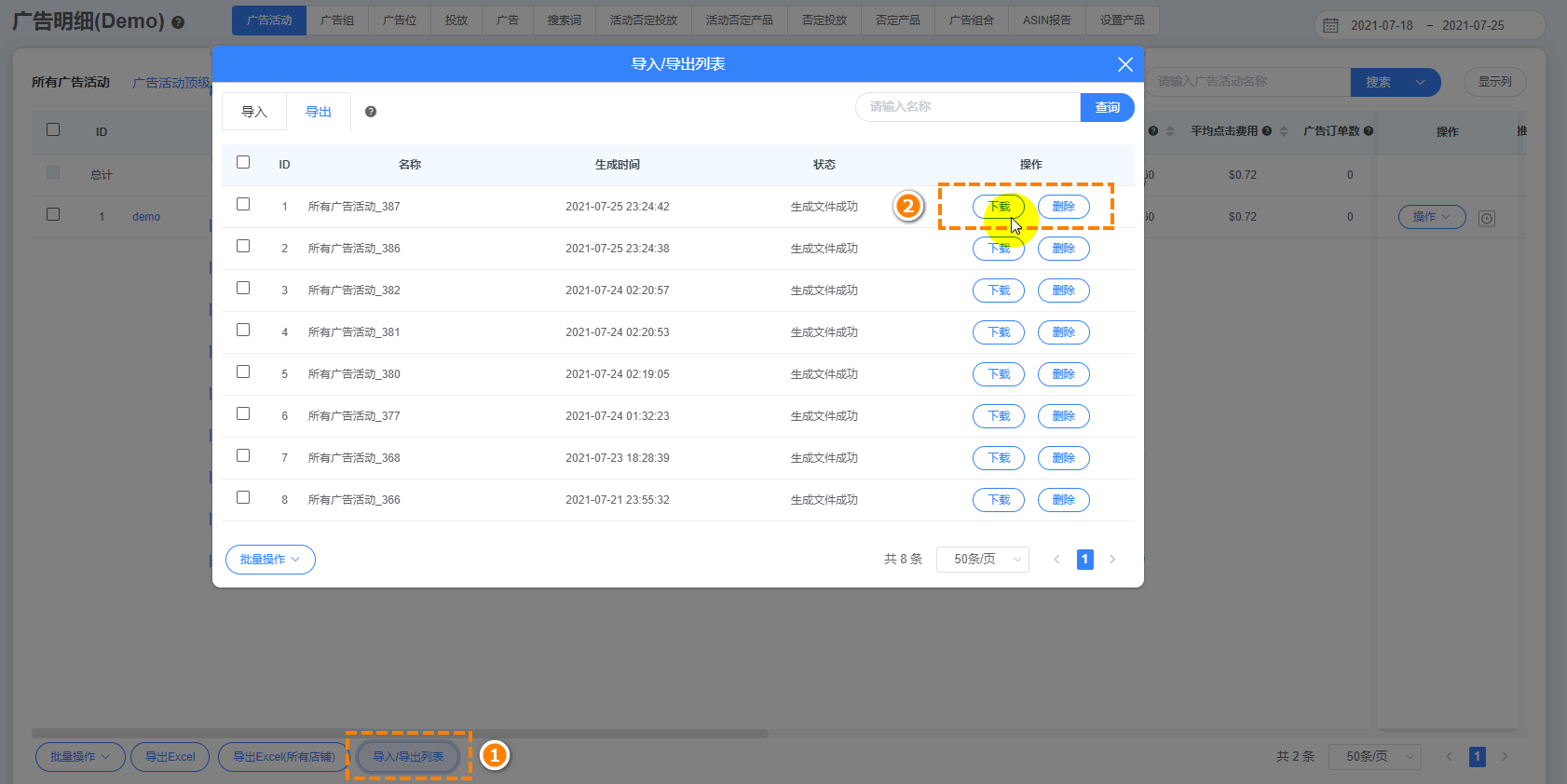 点击需导出数据维度:广告活动/ 广告组/ 广告位/ 广告/ 搜索词/ 活动否定投放/ 活动否定产品/ 否定投放/ 否定产品/ 广告组合/ ASIN报告/ 设置产品