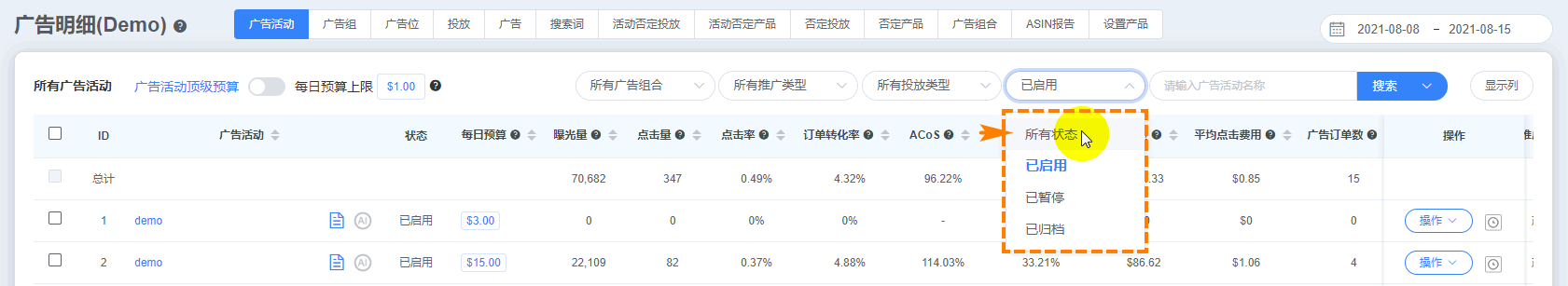 在广告明细功能,系统自动展示广告状态为“已启用”的广告活动数据,如出现与广告管理功能广告数据不一致,可选择“所有状态”广告活动筛选条件进一步确定数据是否存在差异。