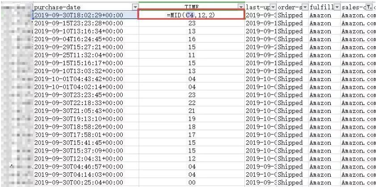 另外在purchase-date后面插入一列,即Time(时间),主要把出单时间筛选出来(精确到hours)。