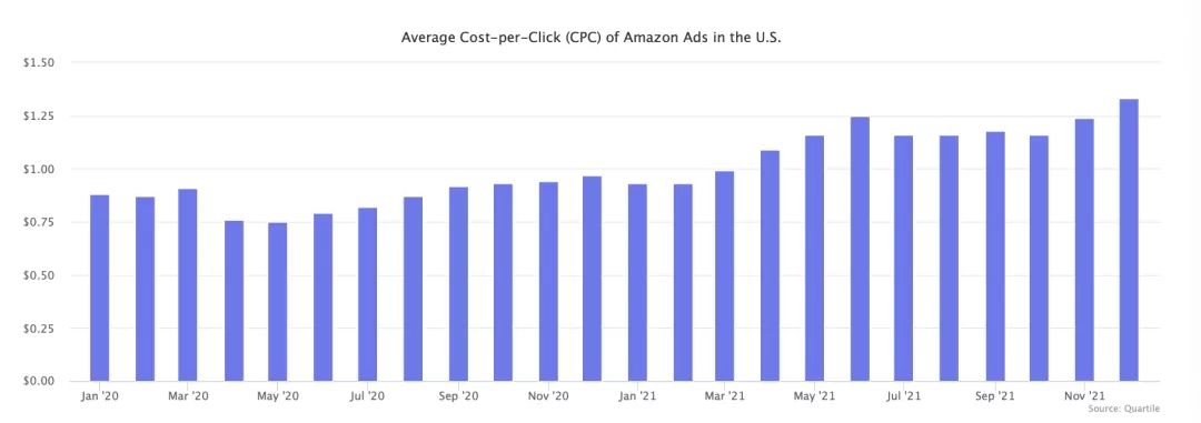根据卖家调研机构MarketPlacePulse的数据,今年12月,亚马逊卖家的广告平均单次广告支出(CPC, Cost per Click)已经高达1.13美金!