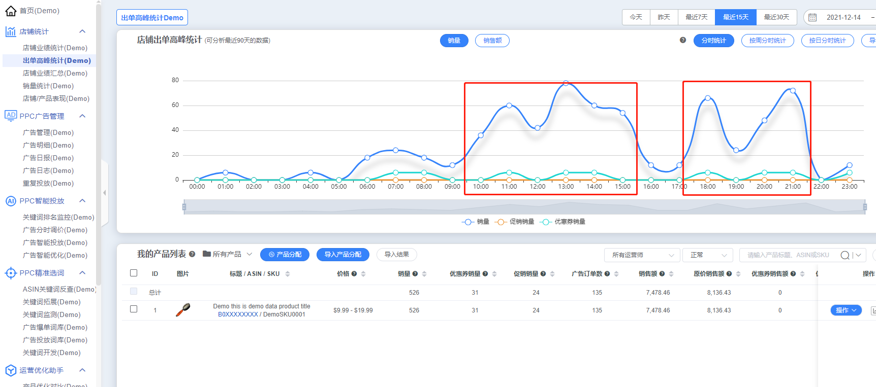 出单高峰统计,这个功能统计了您店铺以及店铺内产品的出单峰值的时间段;结合广告分时调价功能,作为一个依据安排您每天的竞价和预算,把握住流量高峰,把钱用在刀刃上。